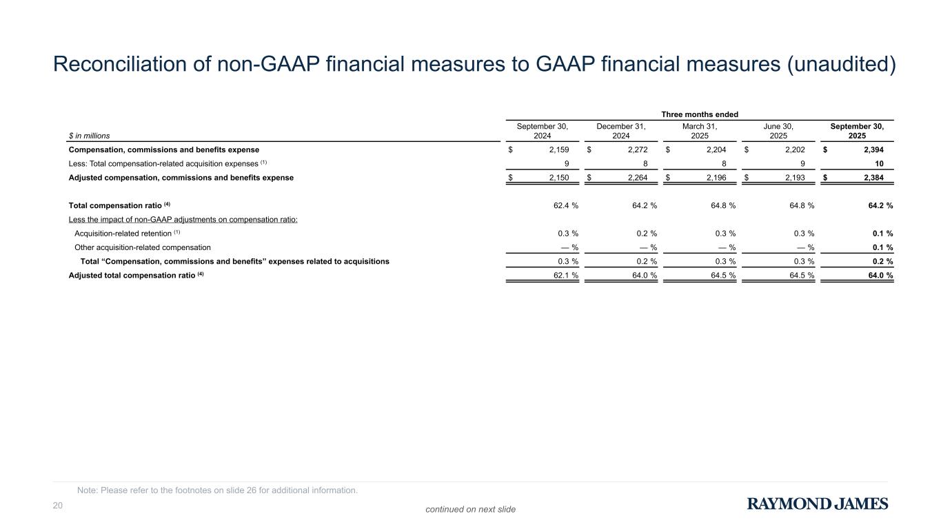 Reconciliation of non-GAAP financial measures to GAAP financial measures (unaudited) Three months ended September 30, 2024 December 31, 2024 March 31, 2025 June 30, 2025 September 30, 2025 Pre-tax margin (3) 22.0 % 21.2 % 19.7 % 16.6 % 19.6 % Impact of non-GAAP adjustments on pre-tax margin: Expenses related to acquisitions: Compensation, commissions and benefits: Acquisition-related retention (1) 0.3 % 0.2 % 0.3 % 0.3 % 0.1 % Other acquisition-related compensation — % — % — % — % 0.1 % Total “Compensation, commissions and benefits” expense 0.3 % 0.2 % 0.3 % 0.3 % 0.2 % Communications and information processing — % — % — % — % 0.1 % Professional fees — % — % — % — % 0.2 % Other: Amortization of identifiable intangible assets (2) 0.3 % 0.3 % 0.3 % 0.2 % 0.3 % All other acquisition-related expenses 0.1 % — % — % — % 0.3 % Total “Other” expense 0.4 % 0.3 % 0.3 % 0.2 % 0.6 % Total pre-tax impact of non-GAAP adjustments related to acquisitions 0.7 % 0.5 % 0.6 % 0.5 % 1.1 % Adjusted pre-tax margin (3) 22.7 % 21.7 % 20.3 % 17.1 % 20.7 % Note: Please refer to the footnotes on slide 26 for additional information. continued on next slide19
