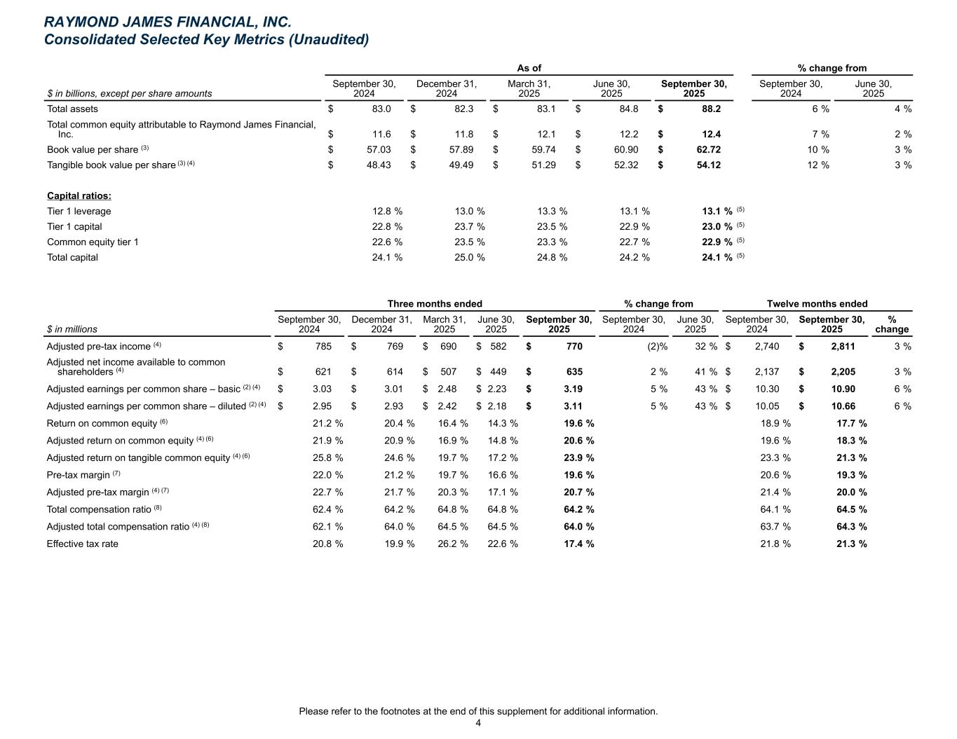 As of % change from $ in billions, except per share amounts September 30, 2024 December 31, 2024 March 31, 2025 June 30, 2025 September 30, 2025 September 30, 2024 June 30, 2025 Total assets $ 83.0 $ 82.3 $ 83.1 $ 84.8 $ 88.2 6 % 4 % Total common equity attributable to Raymond James Financial, Inc. $ 11.6 $ 11.8 $ 12.1 $ 12.2 $ 12.4 7 % 2 % Book value per share (3) $ 57.03 $ 57.89 $ 59.74 $ 60.90 $ 62.72 10 % 3 % Tangible book value per share (3) (4) $ 48.43 $ 49.49 $ 51.29 $ 52.32 $ 54.12 12 % 3 % Capital ratios: Tier 1 leverage 12.8 % 13.0 % 13.3 % 13.1 % 13.1 % (5) Tier 1 capital 22.8 % 23.7 % 23.5 % 22.9 % 23.0 % (5) Common equity tier 1 22.6 % 23.5 % 23.3 % 22.7 % 22.9 % (5) Total capital 24.1 % 25.0 % 24.8 % 24.2 % 24.1 % (5) $ in millions September 30, 2024 December 31, 2024 March 31, 2025 June 30, 2025 September 30, 2025 September 30, 2024 June 30, 2025 September 30, 2024 September 30, 2025 % change Adjusted pre-tax income (4) $ 785 $ 769 $ 690 $ 582 $ 770 (2) % 32 % $ 2,740 $ 2,811 3 % Adjusted net income available to common shareholders (4) $ 621 $ 614 $ 507 $ 449 $ 635 2 % 41 % $ 2,137 $ 2,205 3 % Adjusted earnings per common share – basic (2) (4) $ 3.03 $ 3.01 $ 2.48 $ 2.23 $ 3.19 5 % 43 % $ 10.30 $ 10.90 6 % Adjusted earnings per common share – diluted (2) (4) $ 2.95 $ 2.93 $ 2.42 $ 2.18 $ 3.11 5 % 43 % $ 10.05 $ 10.66 6 % Return on common equity (6) 21.2 % 20.4 % 16.4 % 14.3 % 19.6 % 18.9 % 17.7 % Adjusted return on common equity (4) (6) 21.9 % 20.9 % 16.9 % 14.8 % 20.6 % 19.6 % 18.3 % Adjusted return on tangible common equity (4) (6) 25.8 % 24.6 % 19.7 % 17.2 % 23.9 % 23.3 % 21.3 % Pre-tax margin (7) 22.0 % 21.2 % 19.7 % 16.6 % 19.6 % 20.6 % 19.3 % Adjusted pre-tax margin (4) (7) 22.7 % 21.7 % 20.3 % 17.1 % 20.7 % 21.4 % 20.0 % Total compensation ratio (8) 62.4 % 64.2 % 64.8 % 64.8 % 64.2 % 64.1 % 64.5 % Adjusted total compensation ratio (4) (8) 62.1 % 64.0 % 64.5 % 64.5 % 64.0 % 63.7 % 64.3 % Effective tax rate 20.8 % 19.9 % 26.2 % 22.6 % 17.4 % 21.8 % 21.3 % Three months ended % change from Twelve months ended RAYMOND JAMES FINANCIAL, INC. Consolidated Selected Key Metrics (Unaudited) Please refer to the footnotes at the end of this supplement for additional information. 4
