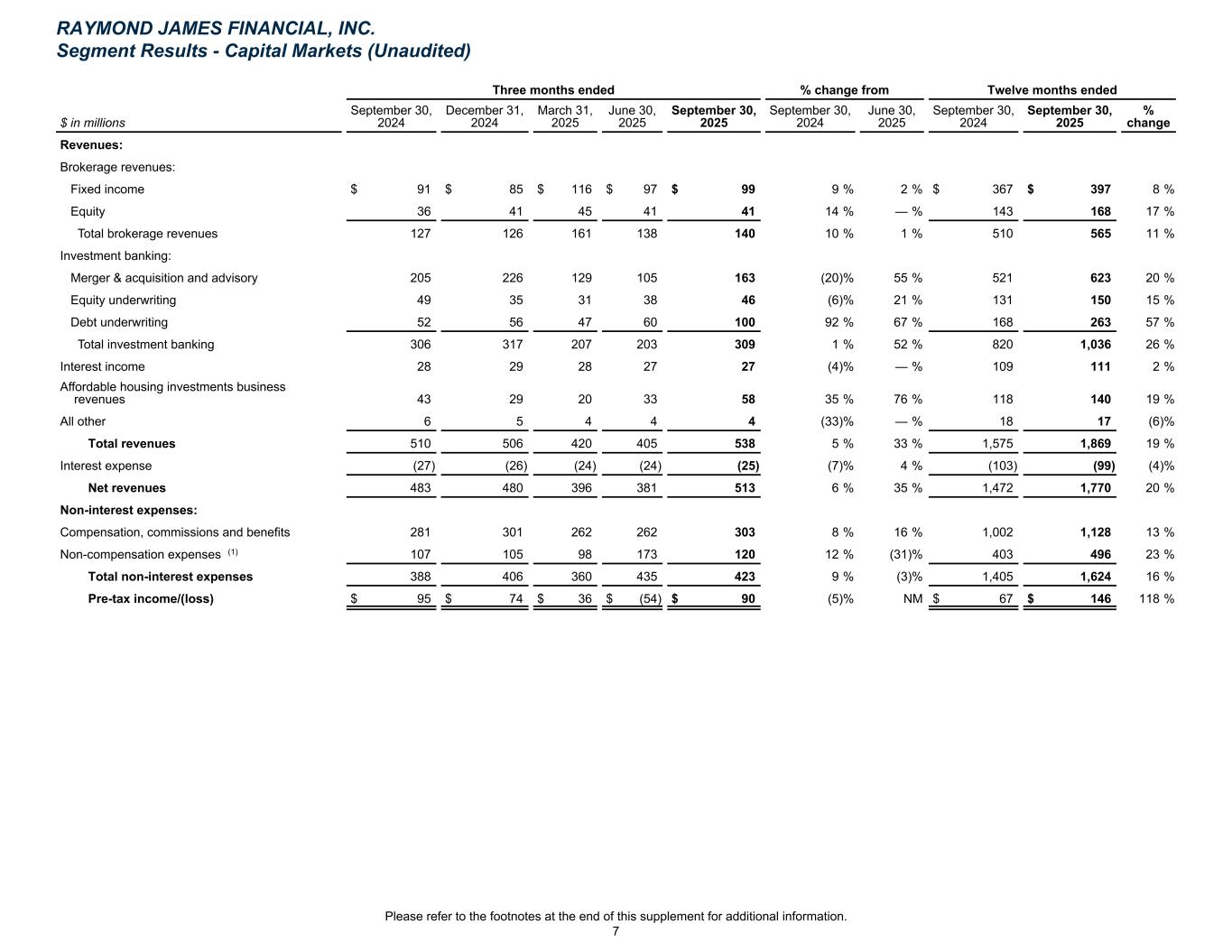 Three months ended % change from Twelve months ended $ in millions September 30, 2024 December 31, 2024 March 31, 2025 June 30, 2025 September 30, 2025 September 30, 2024 June 30, 2025 September 30, 2024 September 30, 2025 % change Revenues: Brokerage revenues: Fixed income $ 91 $ 85 $ 116 $ 97 $ 99 9 % 2 % $ 367 $ 397 8 % Equity 36 41 45 41 41 14 % — % 143 168 17 % Total brokerage revenues 127 126 161 138 140 10 % 1 % 510 565 11 % Investment banking: Merger & acquisition and advisory 205 226 129 105 163 (20) % 55 % 521 623 20 % Equity underwriting 49 35 31 38 46 (6) % 21 % 131 150 15 % Debt underwriting 52 56 47 60 100 92 % 67 % 168 263 57 % Total investment banking 306 317 207 203 309 1 % 52 % 820 1,036 26 % Interest income 28 29 28 27 27 (4) % — % 109 111 2 % Affordable housing investments business revenues 43 29 20 33 58 35 % 76 % 118 140 19 % All other 6 5 4 4 4 (33) % — % 18 17 (6) % Total revenues 510 506 420 405 538 5 % 33 % 1,575 1,869 19 % Interest expense (27) (26) (24) (24) (25) (7) % 4 % (103) (99) (4) % Net revenues 483 480 396 381 513 6 % 35 % 1,472 1,770 20 % Non-interest expenses: Compensation, commissions and benefits 281 301 262 262 303 8 % 16 % 1,002 1,128 13 % Non-compensation expenses (1) 107 105 98 173 120 12 % (31) % 403 496 23 % Total non-interest expenses 388 406 360 435 423 9 % (3) % 1,405 1,624 16 % Pre-tax income/(loss) $ 95 $ 74 $ 36 $ (54) $ 90 (5) % NM $ 67 $ 146 118 % RAYMOND JAMES FINANCIAL, INC. Segment Results - Capital Markets (Unaudited) Please refer to the footnotes at the end of this supplement for additional information. 7