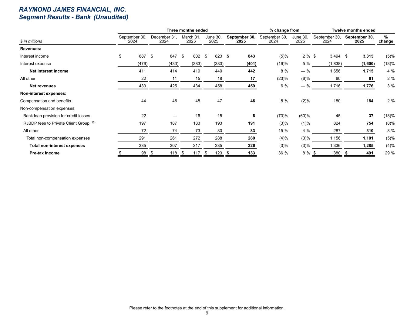 Three months ended % change from Twelve months ended $ in millions September 30, 2024 December 31, 2024 March 31, 2025 June 30, 2025 September 30, 2025 September 30, 2024 June 30, 2025 September 30, 2024 September 30, 2025 % change Revenues: Interest income $ 887 $ 847 $ 802 $ 823 $ 843 (5) % 2 % $ 3,494 $ 3,315 (5) % Interest expense (476) (433) (383) (383) (401) (16) % 5 % (1,838) (1,600) (13) % Net interest income 411 414 419 440 442 8 % — % 1,656 1,715 4 % All other 22 11 15 18 17 (23) % (6) % 60 61 2 % Net revenues 433 425 434 458 459 6 % — % 1,716 1,776 3 % Non-interest expenses: Compensation and benefits 44 46 45 47 46 5 % (2) % 180 184 2 % Non-compensation expenses: Bank loan provision for credit losses 22 — 16 15 6 (73) % (60) % 45 37 (18) % RJBDP fees to Private Client Group (10) 197 187 183 193 191 (3) % (1) % 824 754 (8) % All other 72 74 73 80 83 15 % 4 % 287 310 8 % Total non-compensation expenses 291 261 272 288 280 (4) % (3) % 1,156 1,101 (5) % Total non-interest expenses 335 307 317 335 326 (3) % (3) % 1,336 1,285 (4) % Pre-tax income $ 98 $ 118 $ 117 $ 123 $ 133 36 % 8 % $ 380 $ 491 29 % RAYMOND JAMES FINANCIAL, INC. Segment Results - Bank (Unaudited) Please refer to the footnotes at the end of this supplement for additional information. 9