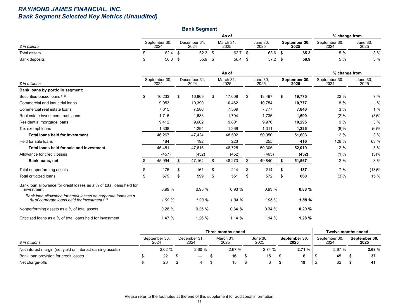 Bank Segment As of % change from $ in billions September 30, 2024 December 31, 2024 March 31, 2025 June 30, 2025 September 30, 2025 September 30, 2024 June 30, 2025 Total assets $ 62.4 $ 62.3 $ 62.7 $ 63.6 $ 65.3 5 % 3 % Bank deposits $ 56.0 $ 55.9 $ 56.4 $ 57.2 $ 58.9 5 % 3 % As of % change from $ in millions September 30, 2024 December 31, 2024 March 31, 2025 June 30, 2025 September 30, 2025 September 30, 2024 June 30, 2025 Bank loans by portfolio segment: Securities-based loans (15) $ 16,233 $ 16,869 $ 17,608 $ 18,497 $ 19,775 22 % 7 % Commercial and industrial loans 9,953 10,390 10,462 10,754 10,777 8 % — % Commercial real estate loans 7,615 7,586 7,569 7,777 7,840 3 % 1 % Real estate investment trust loans 1,716 1,683 1,794 1,735 1,690 (2) % (3) % Residential mortgage loans 9,412 9,602 9,801 9,976 10,295 9 % 3 % Tax-exempt loans 1,338 1,294 1,268 1,311 1,226 (8) % (6) % Total loans held for investment 46,267 47,424 48,502 50,050 51,603 12 % 3 % Held for sale loans 184 192 223 255 416 126 % 63 % Total loans held for sale and investment 46,451 47,616 48,725 50,305 52,019 12 % 3 % Allowance for credit losses (457) (452) (452) (465) (452) (1) % (3) % Bank loans, net $ 45,994 $ 47,164 $ 48,273 $ 49,840 $ 51,567 12 % 3 % Total nonperforming assets $ 175 $ 161 $ 214 $ 214 $ 187 7 % (13) % Total criticized loans $ 679 $ 599 $ 551 $ 572 $ 660 (3) % 15 % Bank loan allowance for credit losses as a % of total loans held for investment 0.99 % 0.95 % 0.93 % 0.93 % 0.88 % Bank loan allowance for credit losses on corporate loans as a % of corporate loans held for investment (16) 1.99 % 1.93 % 1.94 % 1.96 % 1.88 % Nonperforming assets as a % of total assets 0.28 % 0.26 % 0.34 % 0.34 % 0.29 % Criticized loans as a % of total loans held for investment 1.47 % 1.26 % 1.14 % 1.14 % 1.28 % Three months ended Twelve months ended $ in millions September 30, 2024 December 31, 2024 March 31, 2025 June 30, 2025 September 30, 2025 September 30, 2024 September 30, 2025 Net interest margin (net yield on interest-earning assets) 2.62 % 2.60 % 2.67 % 2.74 % 2.71 % 2.67 % 2.68 % Bank loan provision for credit losses $ 22 $ — $ 16 $ 15 $ 6 $ 45 $ 37 Net charge-offs $ 20 $ 4 $ 15 $ 3 $ 19 $ 62 $ 41 RAYMOND JAMES FINANCIAL, INC. Bank Segment Selected Key Metrics (Unaudited) Please refer to the footnotes at the end of this supplement for additional information. 11