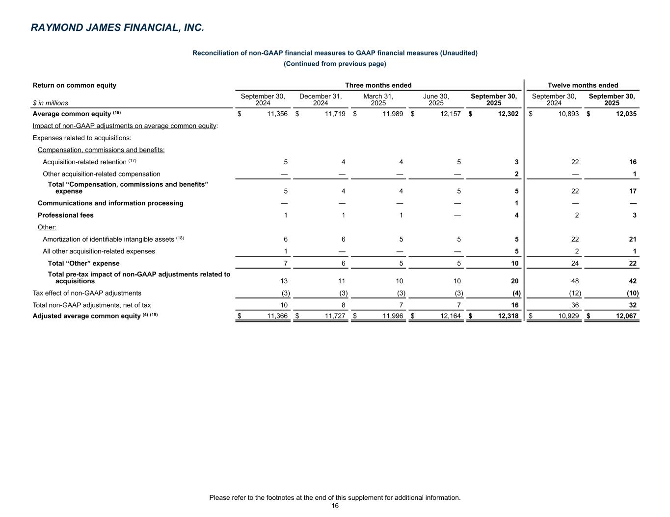 Reconciliation of non-GAAP financial measures to GAAP financial measures (Unaudited) (Continued from previous page) Return on common equity Three months ended Twelve months ended $ in millions September 30, 2024 December 31, 2024 March 31, 2025 June 30, 2025 September 30, 2025 September 30, 2024 September 30, 2025 Average common equity (19) $ 11,356 $ 11,719 $ 11,989 $ 12,157 $ 12,302 $ 10,893 $ 12,035 Impact of non-GAAP adjustments on average common equity: Expenses related to acquisitions: Compensation, commissions and benefits: Acquisition-related retention (17) 5 4 4 5 3 22 16 Other acquisition-related compensation — — — — 2 — 1 Total “Compensation, commissions and benefits” expense 5 4 4 5 5 22 17 Communications and information processing — — — — 1 — — Professional fees 1 1 1 — 4 2 3 Other: Amortization of identifiable intangible assets (18) 6 6 5 5 5 22 21 All other acquisition-related expenses 1 — — — 5 2 1 Total “Other” expense 7 6 5 5 10 24 22 Total pre-tax impact of non-GAAP adjustments related to acquisitions 13 11 10 10 20 48 42 Tax effect of non-GAAP adjustments (3) (3) (3) (3) (4) (12) (10) Total non-GAAP adjustments, net of tax 10 8 7 7 16 36 32 Adjusted average common equity (4) (19) $ 11,366 $ 11,727 $ 11,996 $ 12,164 $ 12,318 $ 10,929 $ 12,067 RAYMOND JAMES FINANCIAL, INC. Please refer to the footnotes at the end of this supplement for additional information. 16
