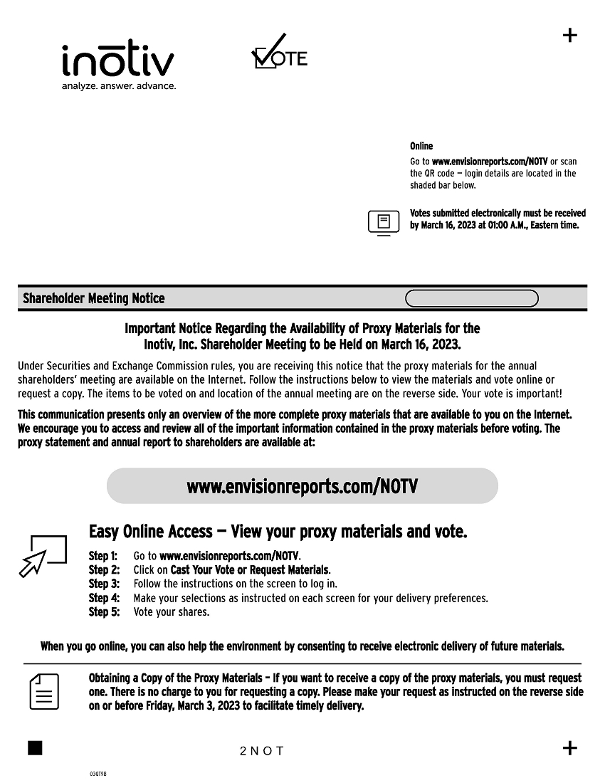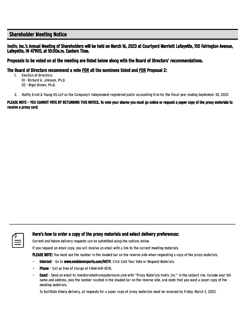 Shareholder Meeting Notice Inotiv, Inc.’s Annual Meeting of Shareholders will be held on March 16, 2023 at Courtyard Marriott Lafayette, 150 Fairington Avenue, Lafayette, IN 47905, at 10:00a.m. Eastern Time. Proposals to be voted on at the meeting are listed below along with the Board of Directors’ recommendations. The Board of Directors recommend a vote FOR all the nominees listed and FOR Proposal 2: 1. Election of Directors: 1 - Richard A. Johnson, Ph.D. 2 - Nigel Brown, Ph.D. 2. Ratify Ernst & Young US LLP as the Company’s independent registered public accounting firm for the fiscal year ending September 30, 2023 PLEASE NOTE – YOU CANNOT VOTE BY RETURNING THIS NOTICE. To vote your shares you must go online or request a paper copy of the proxy materials to receive a proxy card. Here’s how to order a copy of the proxy materials and select delivery preferences: Current and future delivery requests can be submitted using the options below. If you request an email copy, you will receive an email with a link to the current meeting materials. PLEASE NOTE: You must use the number in the shaded bar on the reverse side when requesting a copy of the proxy materials. — Internet – Go to www.envisionreports.com/NOTV. Click Cast Your Vote or Request Materials. — Phone – Call us free of charge at 1-866-641-4276. — Email – Send an email to investorvote@computershare.com with “Proxy Materials Inotiv, Inc.” in the subject line. Include your full name and address, plus the number located in the shaded bar on the reverse side, and state that you want a paper copy of the meeting materials. To facilitate timely delivery, all requests for a paper copy of proxy materials must be received by Friday, March 3, 2023.