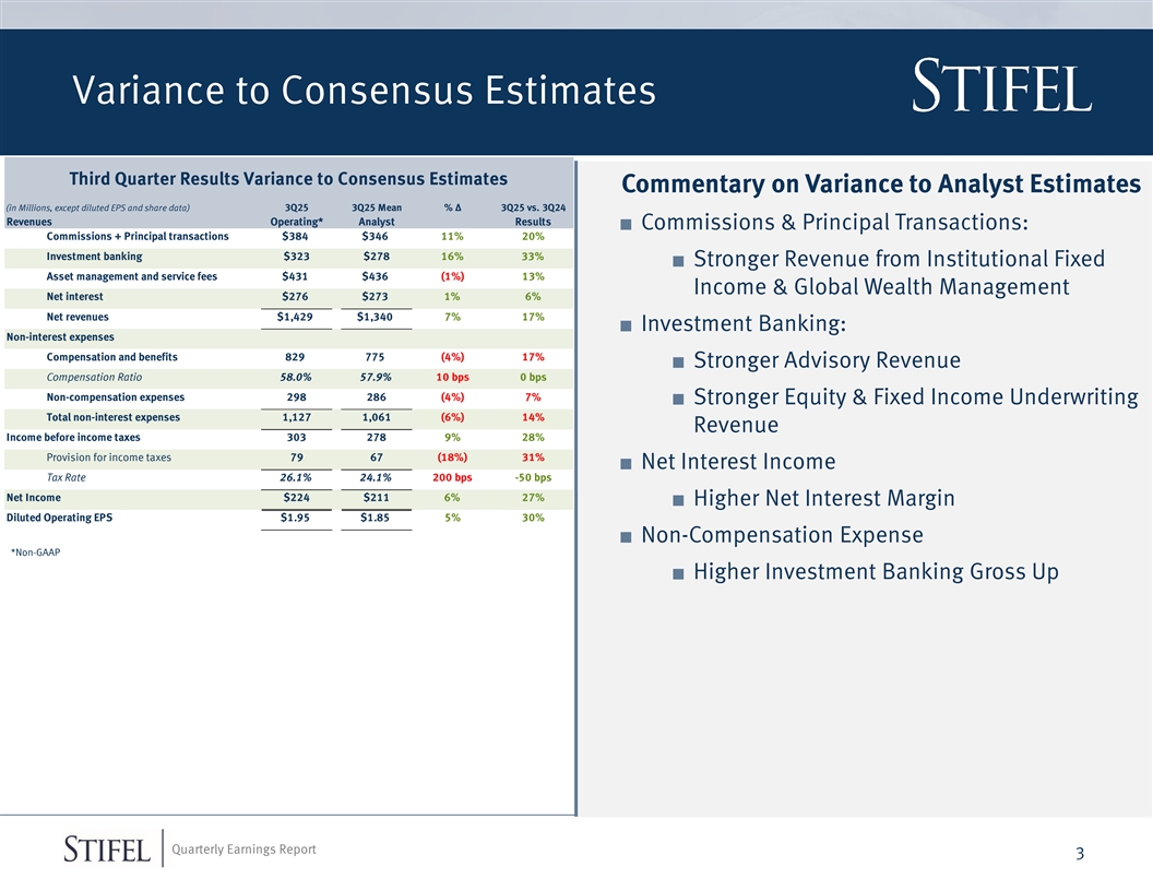 Variance to Consensus Estimates Third Quarter Results Variance to Consensus Estimates Commentary on Variance to Analyst Estimates (in Millions, except diluted EPS and share data) 3Q25 3Q25 Mean % ∆ 3Q25 vs. 3Q24 Revenues Operating* Analyst Results ■ Commissions & Principal Transactions: Commissions + Principal transactions $384 $346 11% 20% Investment banking $323 $278 16% 33% ■ Stronger Revenue from Institutional Fixed Asset management and service fees $431 $436 (1%) 13% Income & Global Wealth Management Net interest $276 $273 1% 6% Net revenues $1,429 $1,340 7% 17% ■ Investment Banking: Non-interest expenses Compensation and benefits 829 775 (4%) 17% ■ Stronger Advisory Revenue Compensation Ratio 58.0% 57.9% 10 bps 0 bps Non-compensation expenses 298 286 (4%) 7% ■ Stronger Equity & Fixed Income Underwriting Total non-interest expenses 1,127 1,061 (6%) 14% Revenue Income before income taxes 303 278 9% 28% Provision for income taxes 79 67 (18%) 31% ■ Net Interest Income Tax Rate 26.1% 24.1% 200 bps -50 bps Net Income $224 $211 6% 27% ■ Higher Net Interest Margin Diluted Operating EPS $1.95 $1.85 5% 30% ■ Non-Compensation Expense *Non-GAAP ■ Higher Investment Banking Gross Up Quarterly Earnings Report 3