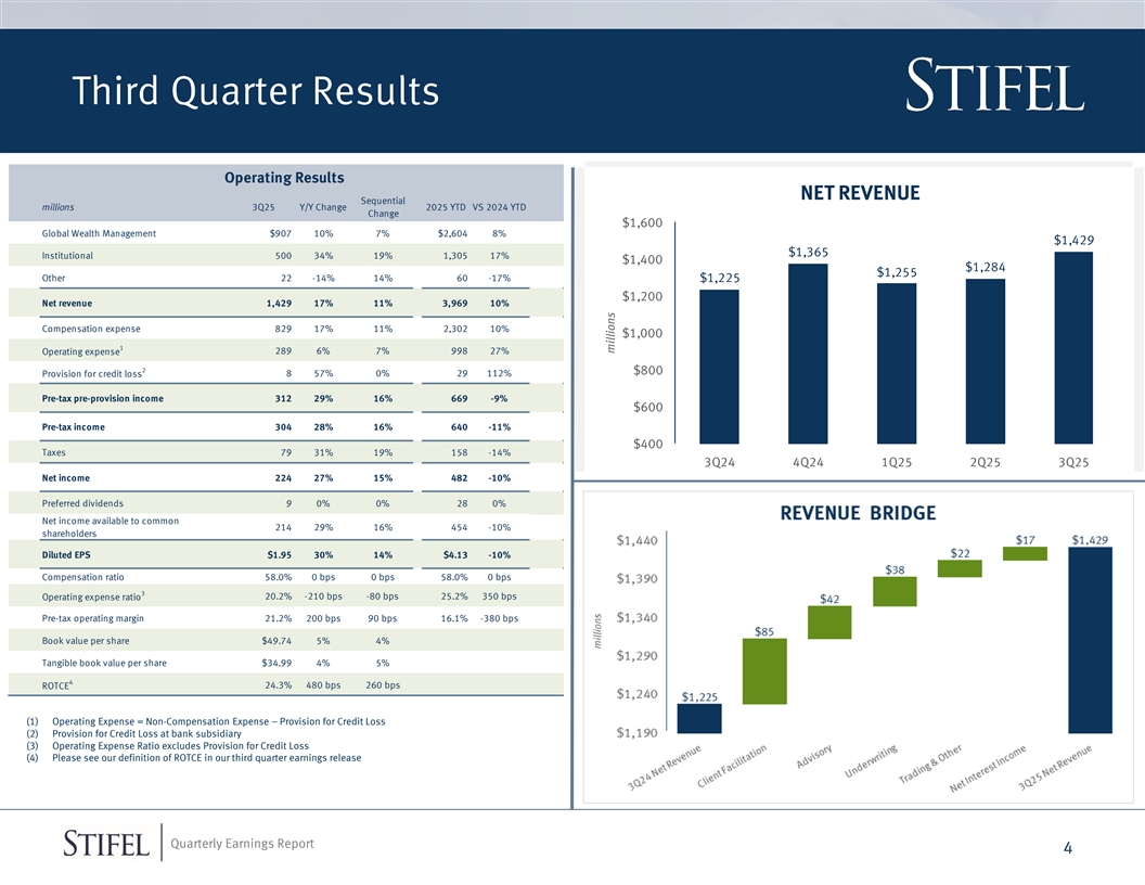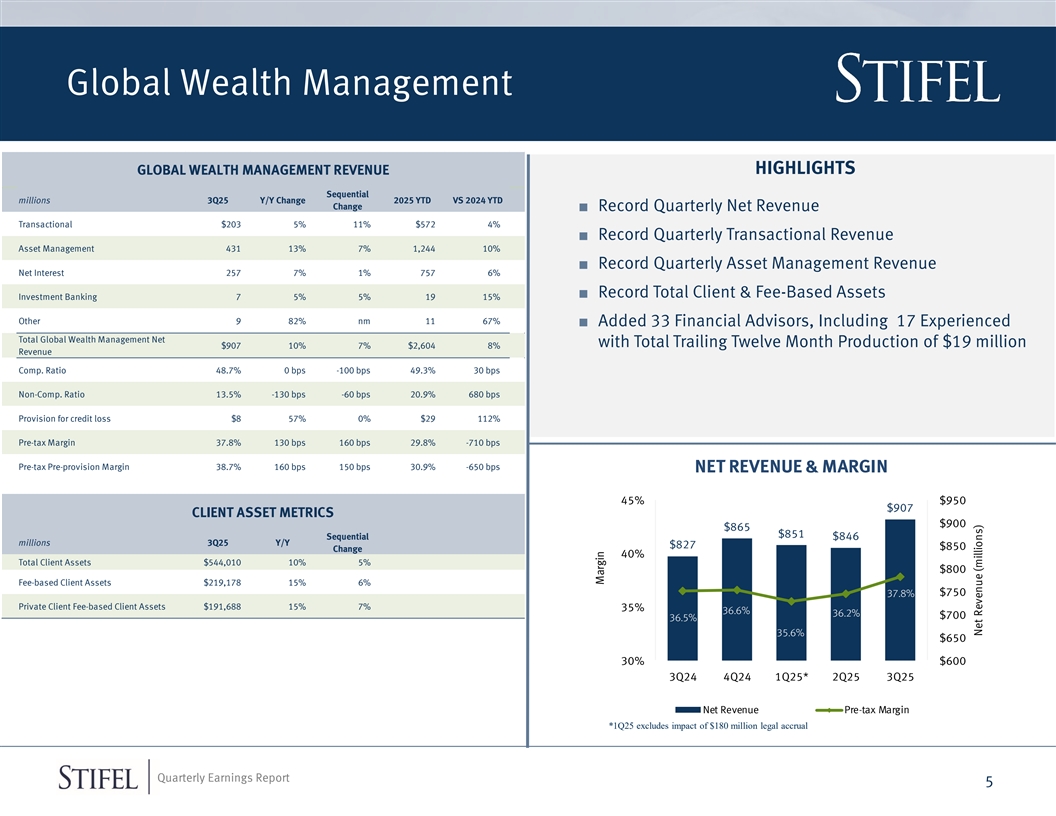 Third Quarter Results Operating Results NET REVENUE Sequential millions 3Q25 Y/Y Change 2025 YTD VS 2024 YTD Change $1,600 Global Wealth Management $907 10% 7% $2,604 8% $1,429 $1,365 Institutional 500 34% 19% 1,305 17% $1,400 $1,284 $1,255 Other 22 -14% 14% 60 -17% $1,225 $1,200 Net revenue 1,429 17% 11% 3,969 10% Compensation expense 829 17% 11% 2,302 10% $1,000 1 289 6% 7% 998 27% Operating expense 2 $800 8 57% 0% 29 112% Provision for credit loss Pre-tax pre-provision income 312 29% 16% 669 -9% $600 Pre-tax income 304 28% 16% 640 -11% $400 Taxes 79 31% 19% 158 -14% 3Q24 4Q24 1Q25 2Q25 3Q25 Net income 224 27% 15% 482 -10% Preferred dividends 9 0% 0% 28 0% Net income available to common 214 29% 16% 454 -10% shareholders Diluted EPS $1.95 30% 14% $4.13 -10% Compensation ratio 58.0% 0 bps 0 bps 58.0% 0 bps 3 Operating expense ratio 20.2% -210 bps -80 bps 25.2% 350 bps Pre-tax operating margin 21.2% 200 bps 90 bps 16.1% -380 bps Book value per share $49.74 5% 4% Tangible book value per share $34.99 4% 5% 4 24.3% 480 bps 260 bps ROTCE (1) Operating Expense = Non-Compensation Expense – Provision for Credit Loss (2) Provision for Credit Loss at bank subsidiary (3) Operating Expense Ratio excludes Provision for Credit Loss (4) Please see our definition of ROTCE in our third quarter earnings release Quarterly Earnings Report 4 millions
