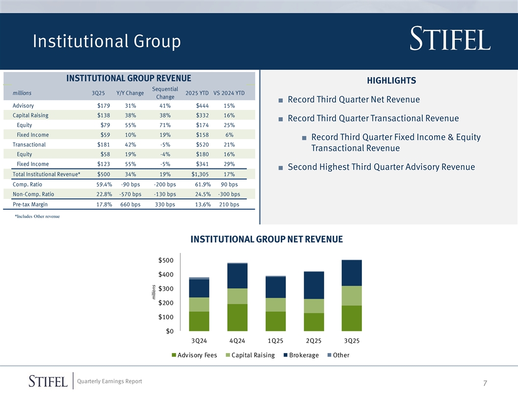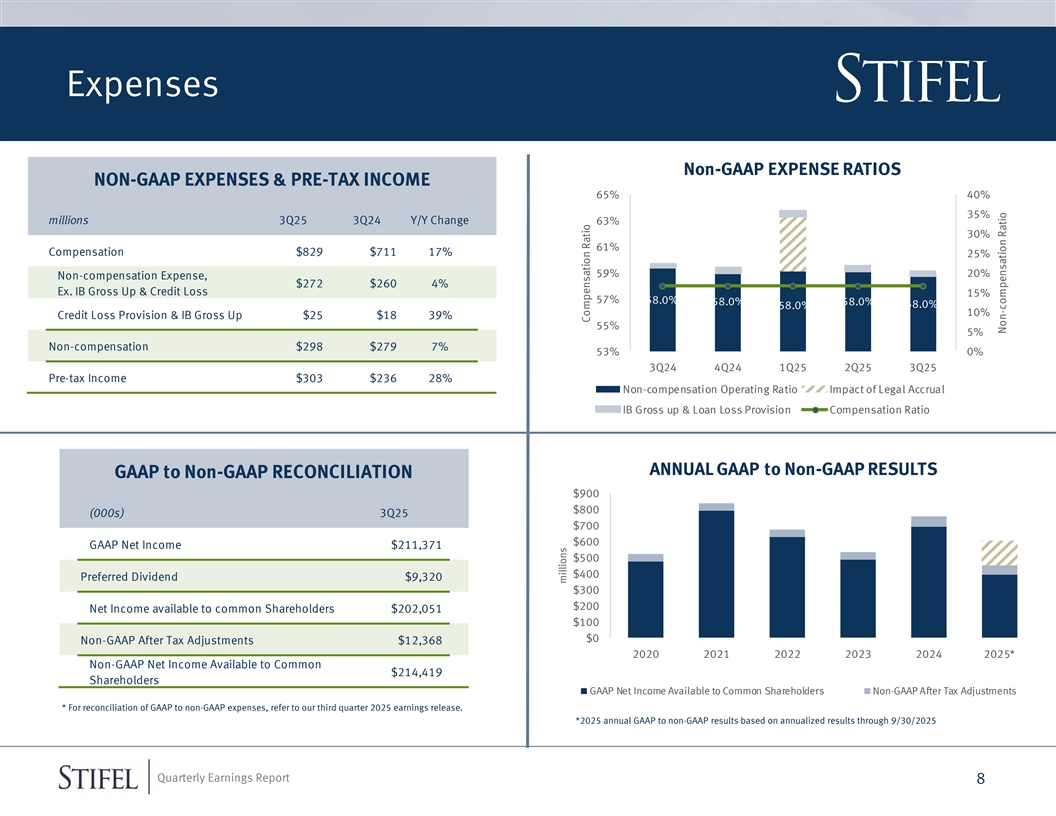 Institutional Group INSTITUTIONAL GROUP REVENUE HIGHLIGHTS Sequential millions 3Q25 Y/Y Change 2025 YTD VS 2024 YTD Change ■ Record Third Quarter Net Revenue Advisory $179 31% 41% $444 15% Capital Raising $138 38% 38% $332 16% ■ Record Third Quarter Transactional Revenue Equity $79 55% 71% $174 25% Fixed Income $59 10% 19% $158 6% ■ Record Third Quarter Fixed Income & Equity Transactional $181 42% -5% $520 21% Transactional Revenue Equity $58 19% -4% $180 16% Fixed Income $123 55% -5% $341 29% ■ Second Highest Third Quarter Advisory Revenue Total Institutional Revenue* $500 34% 19% $1,305 17% Comp. Ratio 59.4% -90 bps -200 bps 61.9% 90 bps Non-Comp. Ratio 22.8% -570 bps -130 bps 24.5% -300 bps Pre-tax Margin 17.8% 660 bps 330 bps 13.6% 210 bps *Includes Other revenue INSTITUTIONAL GROUP NET REVENUE $500 $400 $300 $200 $100 $0 3Q24 4Q24 1Q25 2Q25 3Q25 Advisory Fees Capital Raising Brokerage Other Quarterly Earnings Report 7 millions