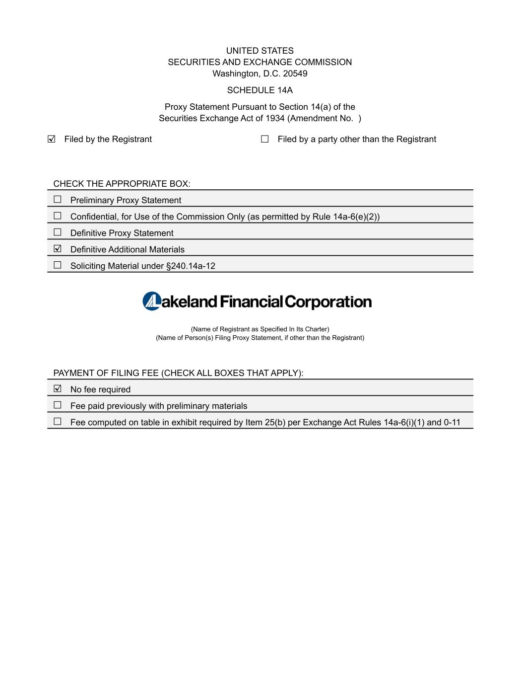 Your Vote Counts! LAKELAND FINANCIAL CORP. ATTN: KRISTIN PRUITT 202 EAST CENTER STREET PO BOX 1387 WARSAW, IN 46581 LAKELAND FINANCIAL CORPORATION You invested in LAKELAND FINANCIAL CORPORATION and it’s time to vote! You have the right to vote on proposals being presented at the Annual Meeting. This is an important notice regarding the availability of proxy material for the shareholder meeting to be held on April 11, 2023. Vote Virtually at the Meeting* April 11, 2023 4:30 p.m., Eastern Time Virtually at: www.virtualshareholdermeeting.com/LKFN2023 *Please check the meeting materials for any special requirements for meeting attendance. Smartphone users Point your camera here and vote without entering a control number V1.1 For complete information and to vote, visit www.ProxyVote.com Control # D99649-P85530-Z84201 Get informed before you vote View the Notice and Proxy Statement, Annual Report and Form 10-K online OR you can receive a free paper or email copy of the material(s) by requesting prior to March 28, 2023. If you would like to request a copy of the material(s) for this and/or future shareholder meetings, you may (1) visit www.ProxyVote.com, (2) call 1-800-579-1639 or (3) send an email to sendmaterial@proxyvote.com. If sending an email, please include your control number (indicated below) in the subject line. Unless requested, you will not otherwise receive a paper or email copy. 2023 Annual Meeting Vote by April 10, 2023 11:59 PM ET. For shares held in a Plan, vote by April 6, 2023 11:59 PM ET.
