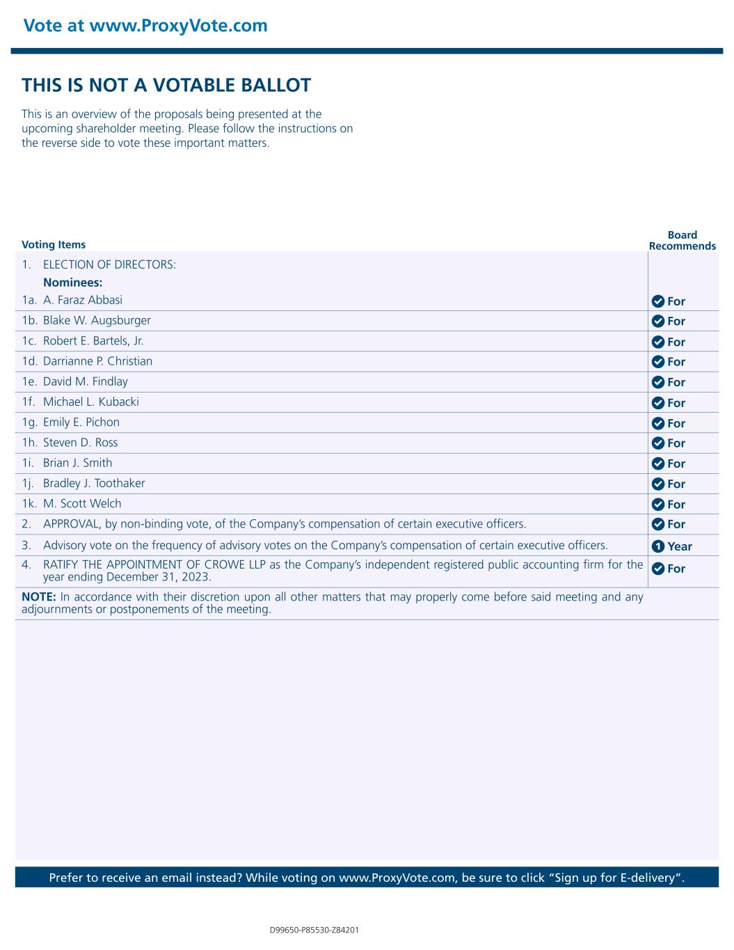 THIS IS NOT A VOTABLE BALLOT This is an overview of the proposals being presented at the upcoming shareholder meeting. Please follow the instructions on the reverse side to vote these important matters. Vote at www.ProxyVote.com Prefer to receive an email instead? While voting on www.ProxyVote.com, be sure to click “Sign up for E-delivery”. Voting Items Board Recommends D99650-P85530-Z84201 1. ELECTION OF DIRECTORS: Nominees: 1c. Robert E. Bartels, Jr. 1a. A. Faraz Abbasi 1d. Darrianne P. Christian 1b. Blake W. Augsburger 1e. David M. Findlay 1f. Michael L. Kubacki 1g. Emily E. Pichon 1h. Steven D. Ross 1i. Brian J. Smith 1j. Bradley J. Toothaker 1k. M. Scott Welch 2. APPROVAL, by non-binding vote, of the Company’s compensation of certain executive officers. 4. RATIFY THE APPOINTMENT OF CROWE LLP as the Company’s independent registered public accounting firm for the year ending December 31, 2023. 3. Advisory vote on the frequency of advisory votes on the Company’s compensation of certain executive officers. NOTE: In accordance with their discretion upon all other matters that may properly come before said meeting and any adjournments or postponements of the meeting. For For For For For For For For For For For For For 1 Year
