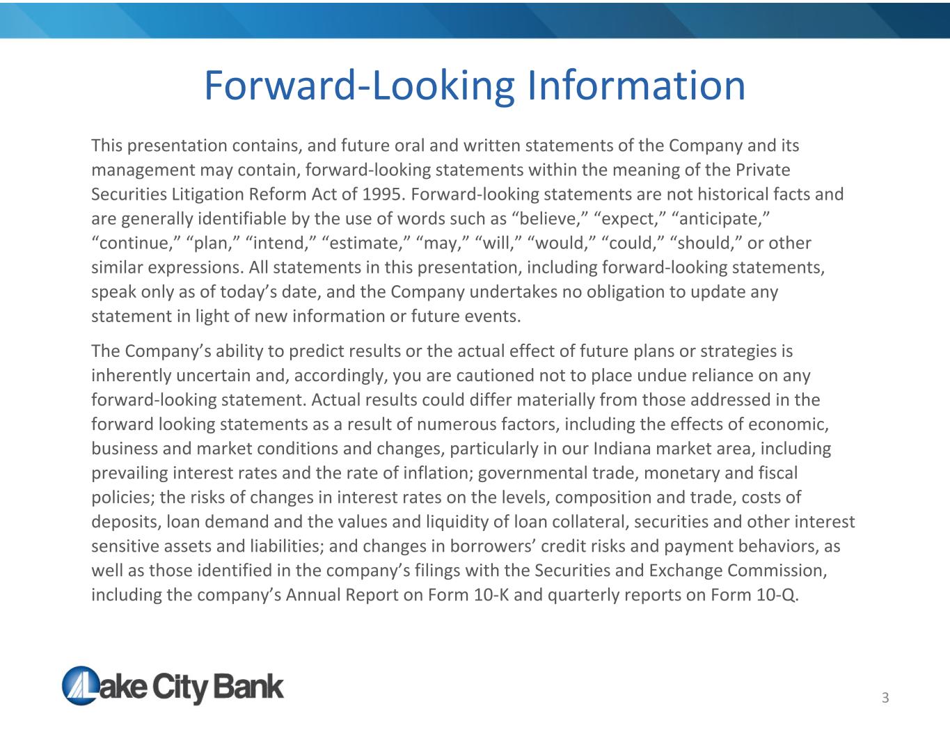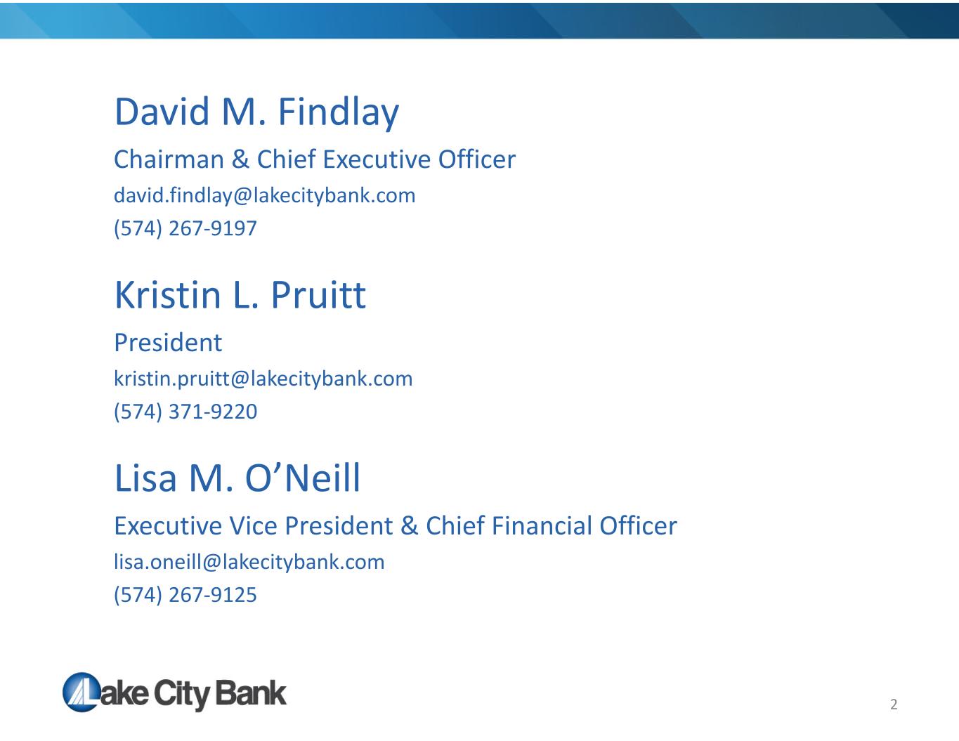 2 David M. Findlay Chairman & Chief Executive Officer david.findlay@lakecitybank.com (574) 267-9197 Kristin L. Pruitt President kristin.pruitt@lakecitybank.com (574) 371-9220 Lisa M. O’Neill Executive Vice President & Chief Financial Officer lisa.oneill@lakecitybank.com (574) 267-9125