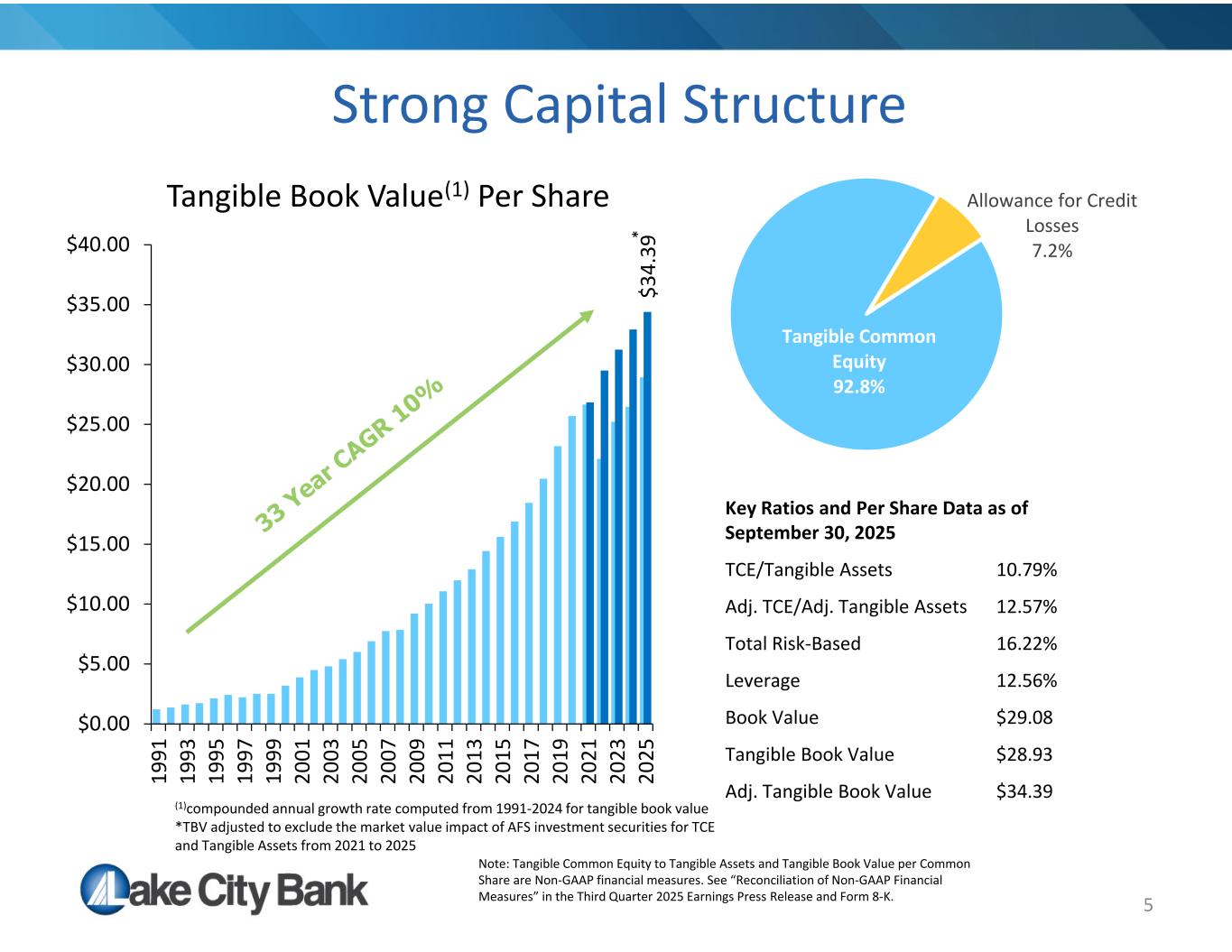 4 Long Term Success for Shareholders LTM ROE >13% Source: S&P Capital IQ Pro. Financial data is as of June 30, 2025. (1) Includes banks and thrifts traded on the NYSE, NYSEAM or NASDAQ as of 10/13/25; excludes merger targets. (2) Defined as having positive net income before extraordinary items and preferred dividends for each of the last 10 years (calendar years ended December 31, 2015 through December 31, 2024). Net income before extraordinary items is defined by S&P Capital IQ Pro as GAAP net income, after taxes, minority interest, and other after tax items, but before any extraordinary items. Excludes any revaluation of net deferred tax assets due to tax reform per S&P Capital IQ Pro. (3) Defined as having compounded annual growth in tangible book value per share from 6/30/05 through 6/30/25 greater than 8%. 20-Year TBVPS CAGR >8%(3) Profitable for the Last 10 Years(2) Exchange Traded Depositories with Assets Between $1B and $10B(1) 5 Institutions 13 Institutions 141 Institutions 183 Institutions (including LKFN) LTM ROE >13%
