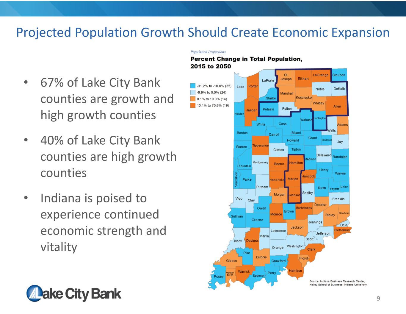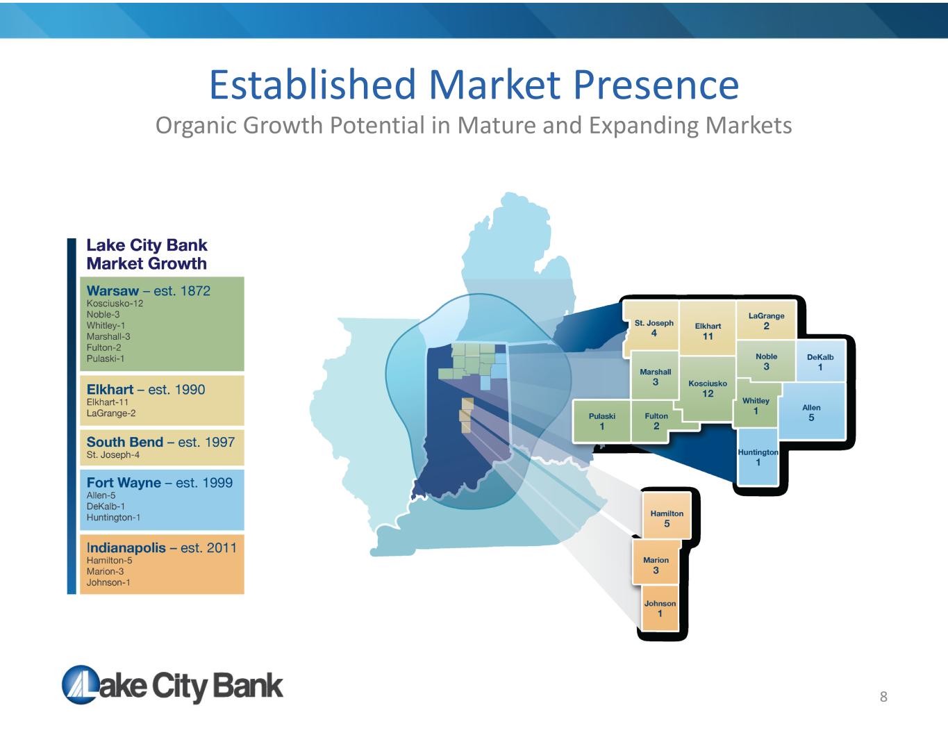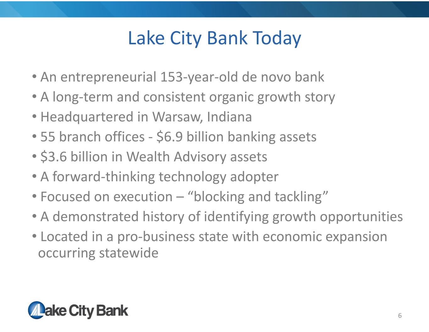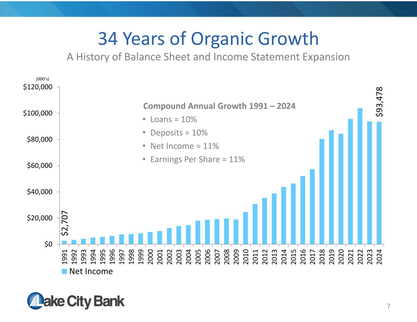 6 Lake City Bank Today • An entrepreneurial 153-year-old de novo bank • A long-term and consistent organic growth story • Headquartered in Warsaw, Indiana • 55 branch offices - $6.9 billion banking assets • $3.6 billion in Wealth Advisory assets • A forward-thinking technology adopter • Focused on execution – “blocking and tackling” • A demonstrated history of identifying growth opportunities • Located in a pro-business state with economic expansion occurring statewide
