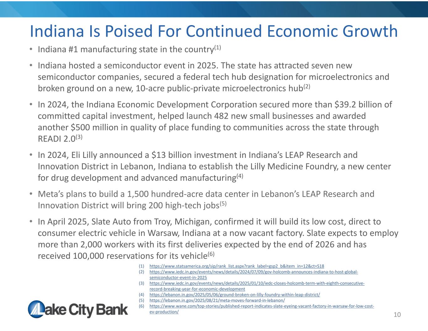 9 Projected Population Growth Should Create Economic Expansion • 67% of Lake City Bank counties are growth and high growth counties • 40% of Lake City Bank counties are high growth counties • Indiana is poised to experience continued economic strength and vitality
