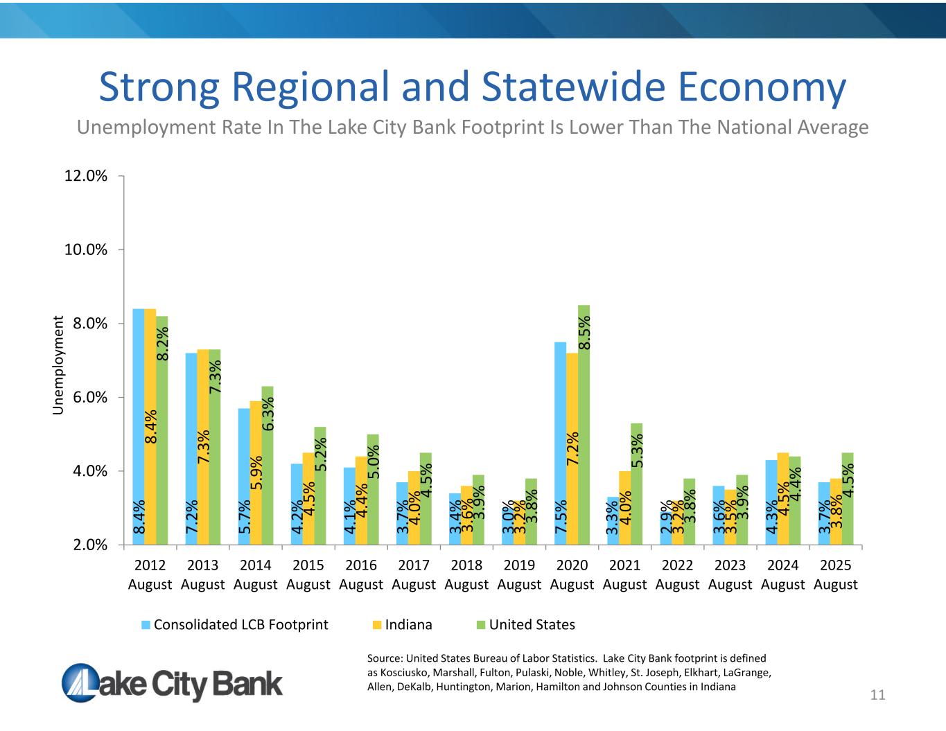 8. 4% 7. 2% 5. 7% 4. 2% 4. 1% 3. 7% 3. 4% 3. 0% 7. 5% 3. 3% 2. 9% 3. 6% 4. 3% 3. 7% 8. 4% 7. 3% 5. 9% 4. 5% 4. 4% 4. 0% 3. 6% 3. 2% 7. 2% 4. 0% 3. 2% 3. 5% 4. 5% 3. 8% 8. 2% 7. 3% 6. 3% 5. 2% 5. 0% 4. 5% 3. 9% 3. 8% 8. 5% 5. 3% 3. 8% 3. 9% 4. 4% 4. 5% 2.0% 4.0% 6.0% 8.0% 10.0% 12.0% 2012 August 2013 August 2014 August 2015 August 2016 August 2017 August 2018 August 2019 August 2020 August 2021 August 2022 August 2023 August 2024 August 2025 August Consolidated LCB Footprint Indiana United States 11 Strong Regional and Statewide Economy Unemployment Rate In The Lake City Bank Footprint Is Lower Than The National Average U ne m pl oy m en t Source: United States Bureau of Labor Statistics. Lake City Bank footprint is defined as Kosciusko, Marshall, Fulton, Pulaski, Noble, Whitley, St. Joseph, Elkhart, LaGrange, Allen, DeKalb, Huntington, Marion, Hamilton and Johnson Counties in Indiana