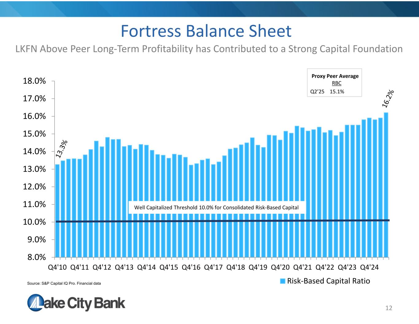 12 Fortress Balance Sheet LKFN Above Peer Long-Term Profitability has Contributed to a Strong Capital Foundation 8.0% 9.0% 10.0% 11.0% 12.0% 13.0% 14.0% 15.0% 16.0% 17.0% 18.0% Q4'10 Q4'11 Q4'12 Q4'13 Q4'14 Q4'15 Q4'16 Q4'17 Q4'18 Q4'19 Q4'20 Q4'21 Q4'22 Q4'23 Q4'24 Risk-Based Capital Ratio Proxy Peer Average RBC Q2’25 15.1% Well Capitalized Threshold 10.0% for Consolidated Risk-Based Capital Source: S&P Capital IQ Pro. Financial data