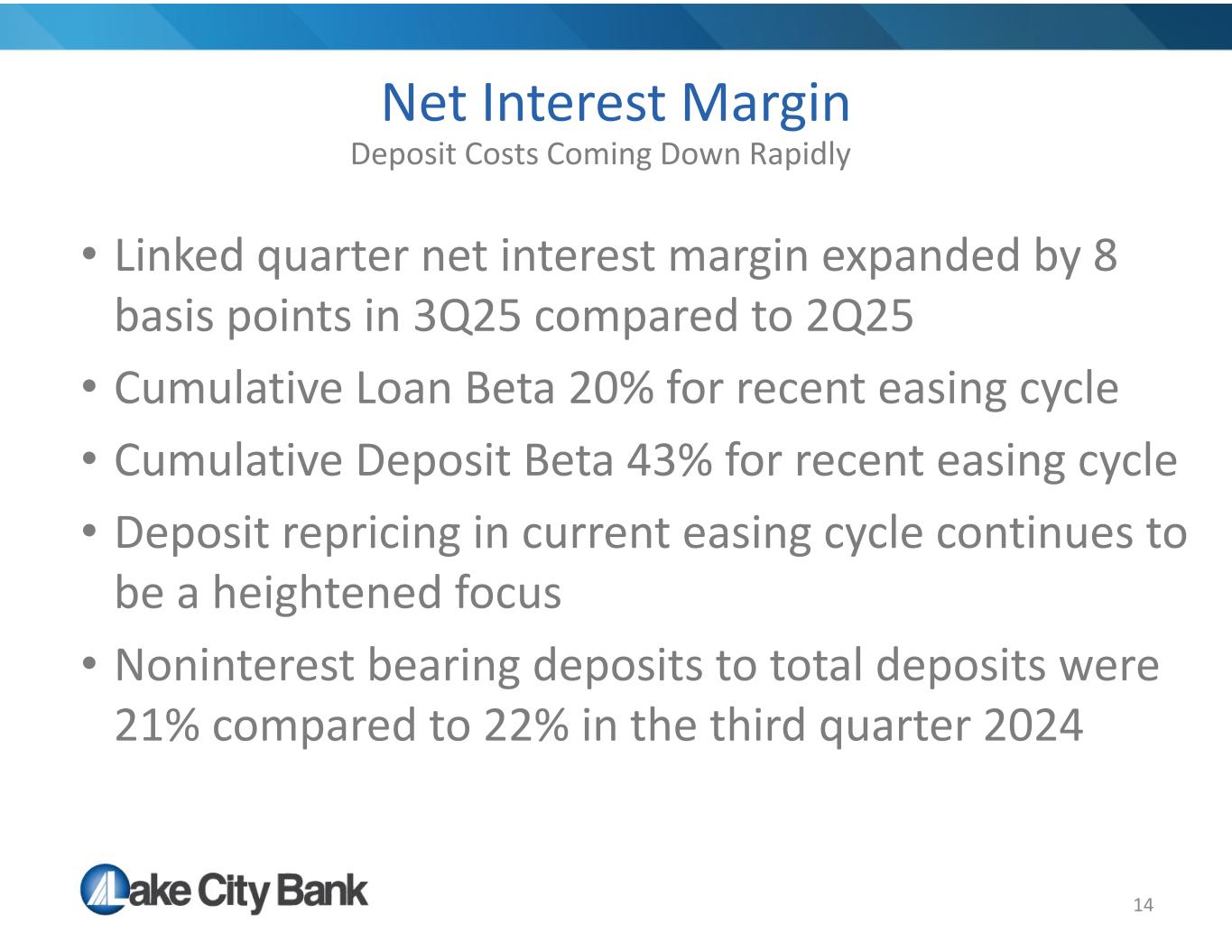 13 Net Interest Margin by Quarter NIM Expansion of 34 Basis Points Over Last Twelve Months 3.16% 3.25% 3.40% 3.42% 3.50% 3.00% 3.50% Q3 2024 Q4 2024 Q1 2025 Q2 2025 Q3 2025 Quarterly NIM