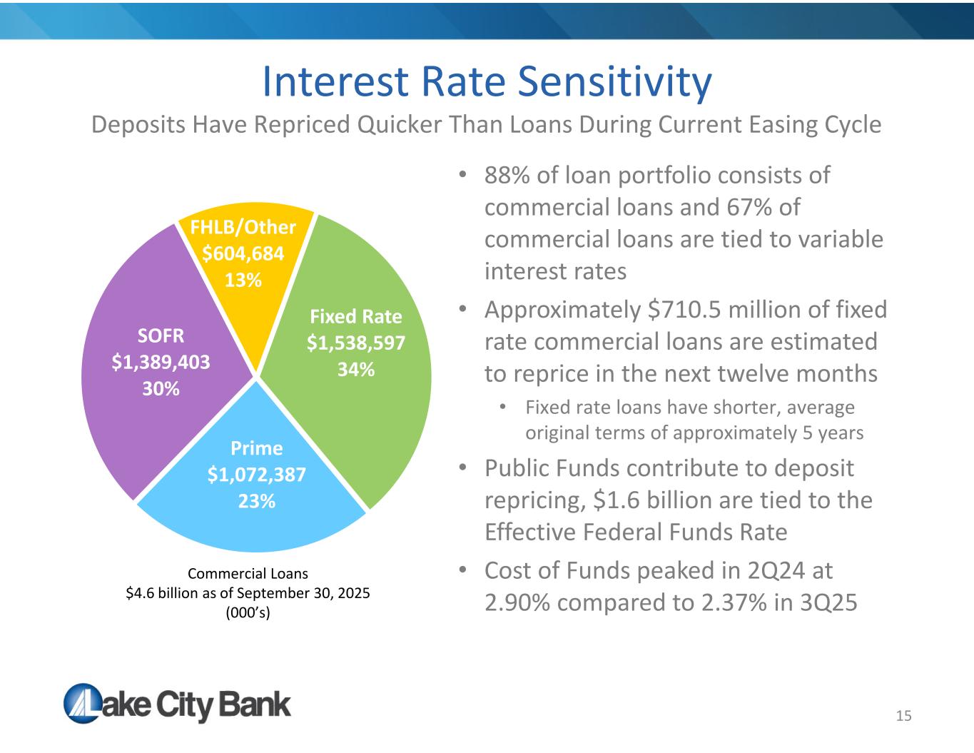 14 Net Interest Margin Deposit Costs Coming Down Rapidly • Linked quarter net interest margin expanded by 8 basis points in 3Q25 compared to 2Q25 • Cumulative Loan Beta 20% for recent easing cycle • Cumulative Deposit Beta 43% for recent easing cycle • Deposit repricing in current easing cycle continues to be a heightened focus • Noninterest bearing deposits to total deposits were 21% compared to 22% in the third quarter 2024