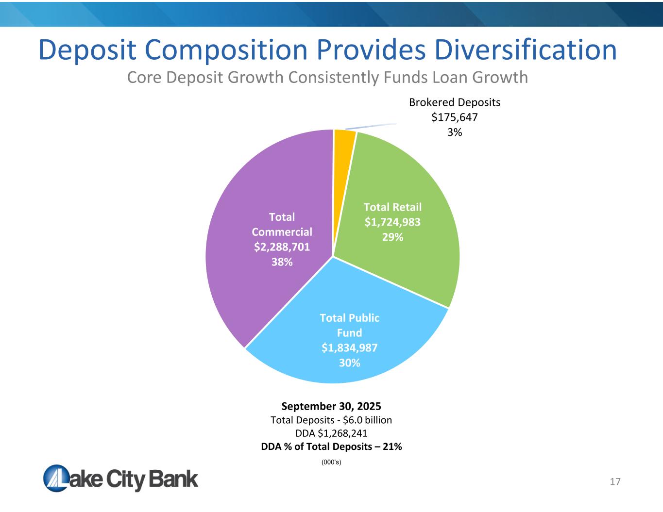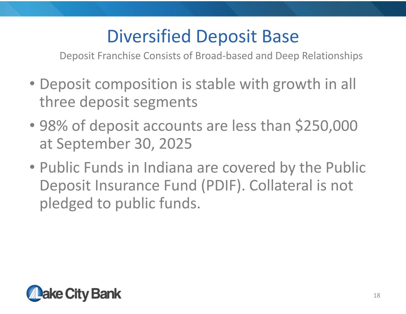 17 Deposit Composition Provides Diversification Core Deposit Growth Consistently Funds Loan Growth Total Retail $1,724,983 29% Total Public Fund $1,834,987 30% Total Commercial $2,288,701 38% Brokered Deposits $175,647 3% September 30, 2025 Total Deposits - $6.0 billion DDA $1,268,241 DDA % of Total Deposits – 21% (000’s)