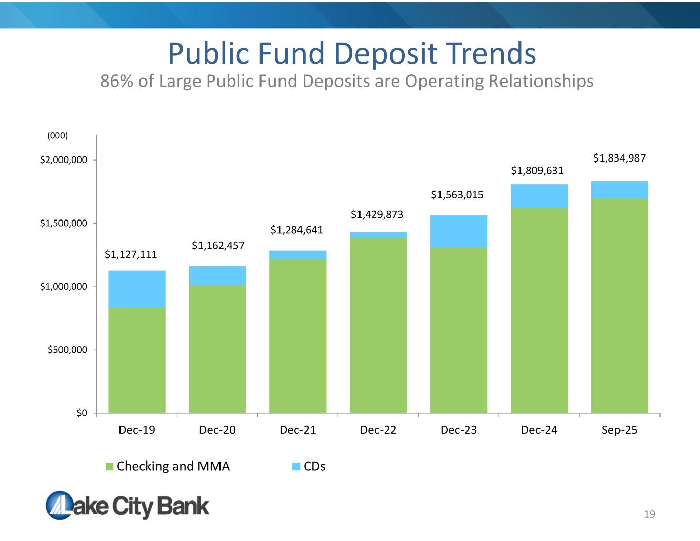 18 Diversified Deposit Base Deposit Franchise Consists of Broad-based and Deep Relationships • Deposit composition is stable with growth in all three deposit segments • 98% of deposit accounts are less than $250,000 at September 30, 2025 • Public Funds in Indiana are covered by the Public Deposit Insurance Fund (PDIF). Collateral is not pledged to public funds.