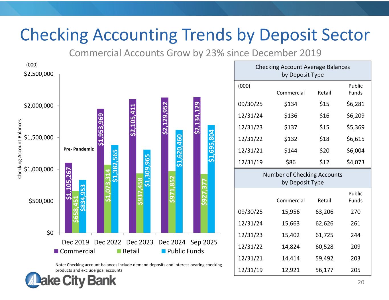 20 Checking Accounting Trends by Deposit Sector Commercial Accounts Grow by 23% since December 2019 $1 ,1 05 ,2 67 $1 ,9 53 ,9 69 $2 ,1 05 ,4 11 $2 ,1 29 ,9 52 $2 ,1 34 ,1 29 $6 58 ,4 51 $1 ,0 73 ,3 14 $9 37 ,4 58 $9 71 ,8 52 $9 27 ,3 77 $8 34 ,9 53 $1 ,3 82 ,5 65 $1 ,3 09 ,9 65 $1 ,6 20 ,4 60 $1 ,6 95 ,8 04 $0 $500,000 $1,000,000 $1,500,000 $2,000,000 $2,500,000 Dec 2019 Dec 2022 Dec 2023 Dec 2024 Sep 2025 Commercial Retail Public Funds Ch ec ki ng A cc ou nt B al an ce s Checking Account Average Balances by Deposit Type Public FundsRetailCommercial (000) $6,281$15$13409/30/25 $6,209$16$13612/31/24 $5,369$15$13712/31/23 $6,615$18$13212/31/22 $6,004$20$14412/31/21 $4,073$12$8612/31/19 Number of Checking Accounts by Deposit Type Public FundsRetailCommercial 27063,20615,95609/30/25 26162,62615,66312/31/24 24461,72515,40212/31/23 20960,52814,82412/31/22 20359,49214,41412/31/21 20556,17712,92112/31/19 Pre- Pandemic (000) Note: Checking account balances include demand deposits and interest-bearing checking products and exclude goal accounts