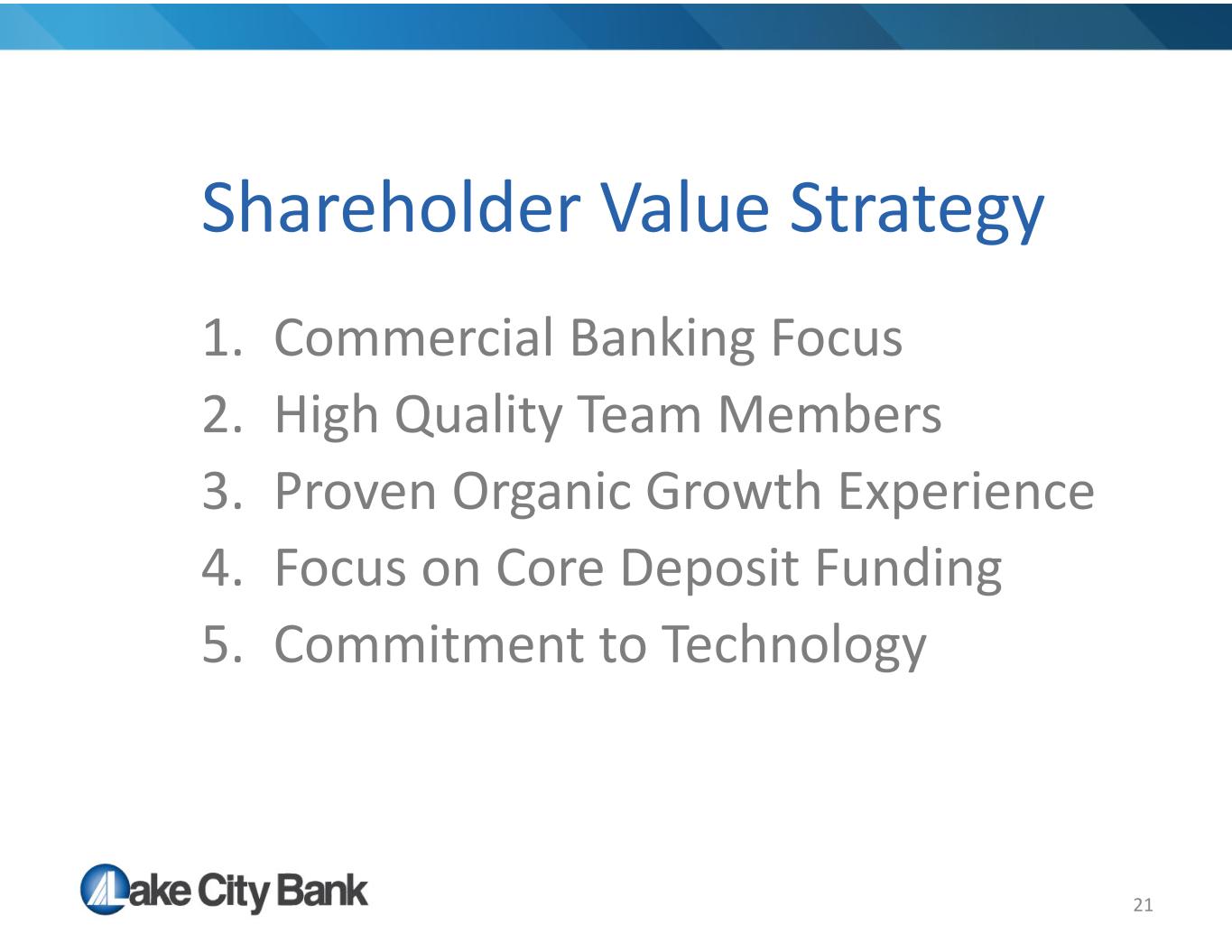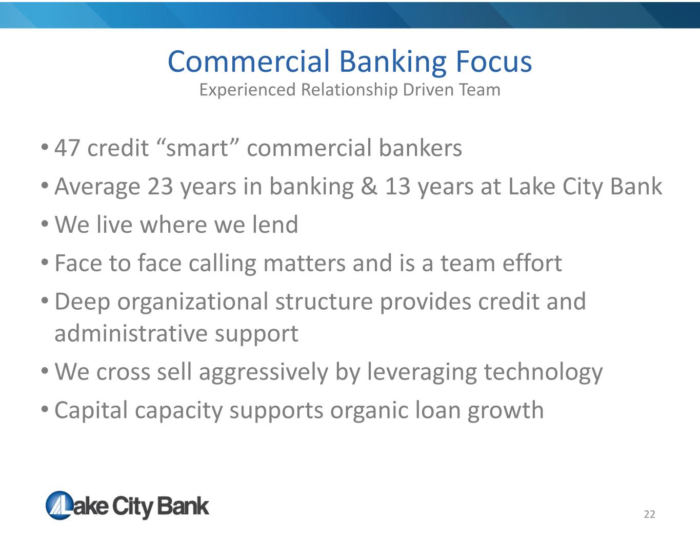 21 Shareholder Value Strategy 1. Commercial Banking Focus 2. High Quality Team Members 3. Proven Organic Growth Experience 4. Focus on Core Deposit Funding 5. Commitment to Technology