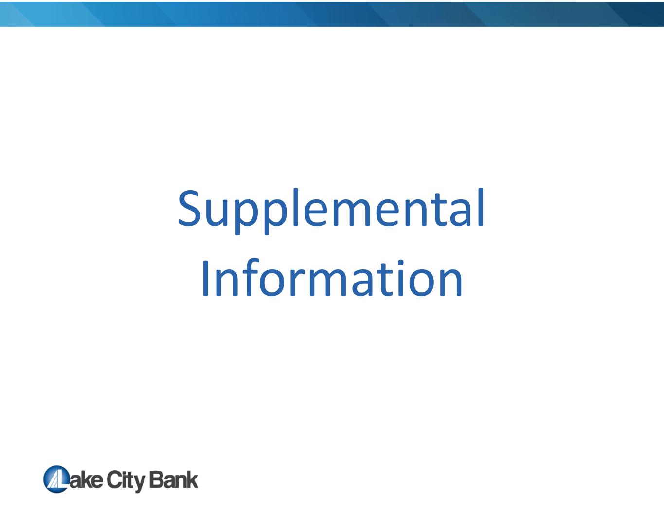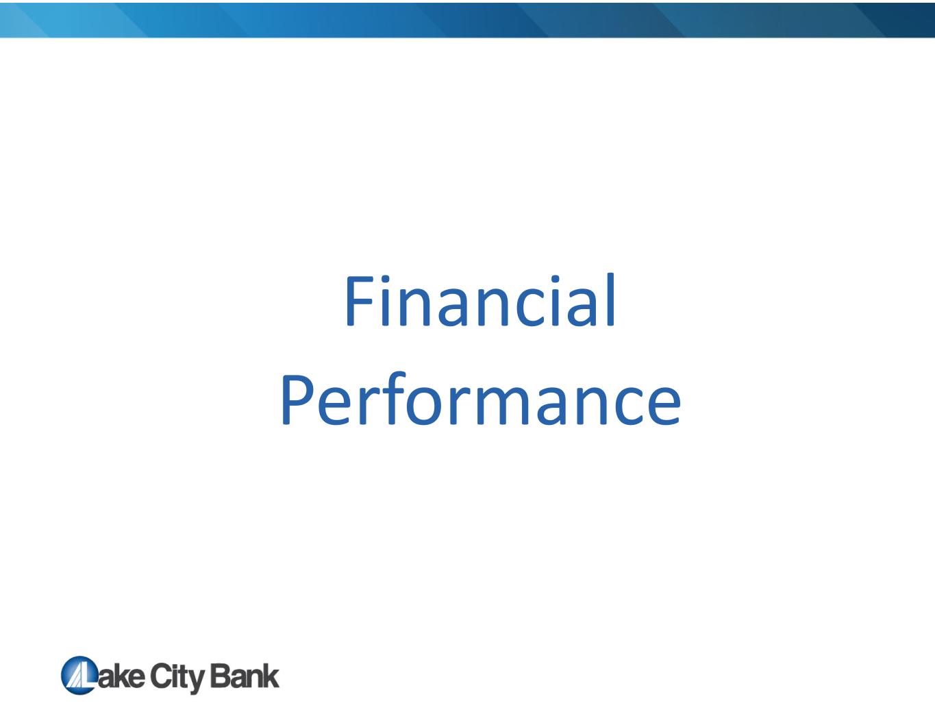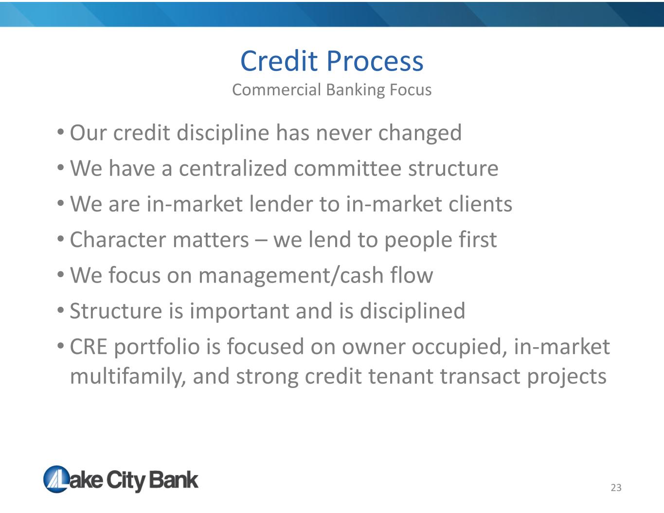 22 Commercial Banking Focus Experienced Relationship Driven Team • 47 credit “smart” commercial bankers • Average 23 years in banking & 13 years at Lake City Bank • We live where we lend • Face to face calling matters and is a team effort • Deep organizational structure provides credit and administrative support • We cross sell aggressively by leveraging technology • Capital capacity supports organic loan growth