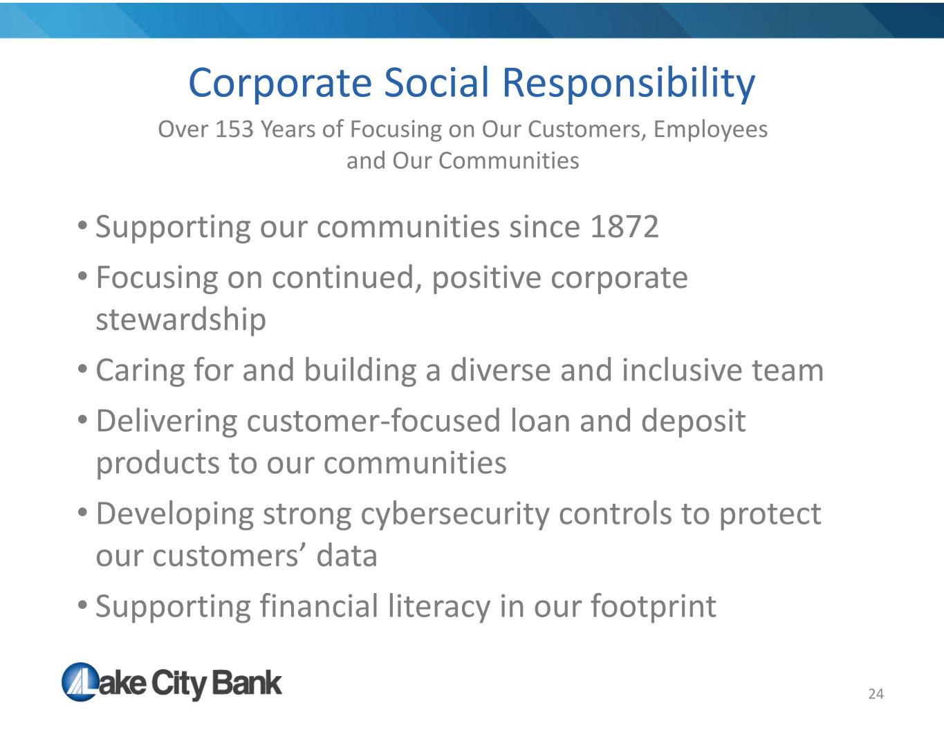 24 Corporate Social Responsibility Over 153 Years of Focusing on Our Customers, Employees and Our Communities • Supporting our communities since 1872 • Focusing on continued, positive corporate stewardship • Caring for and building a diverse and inclusive team • Delivering customer-focused loan and deposit products to our communities • Developing strong cybersecurity controls to protect our customers’ data • Supporting financial literacy in our footprint