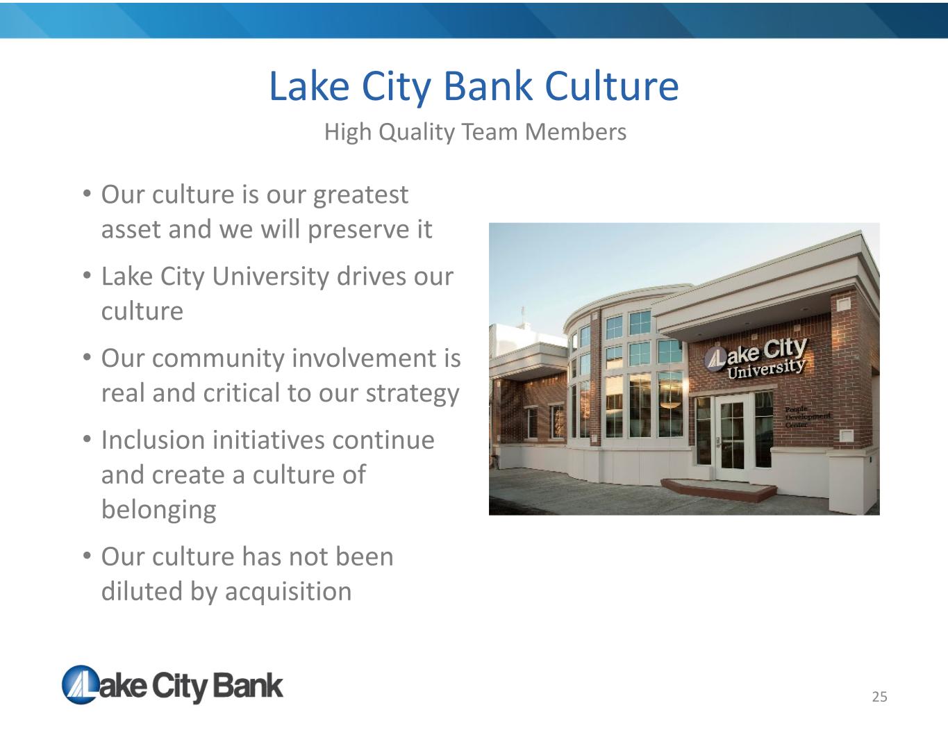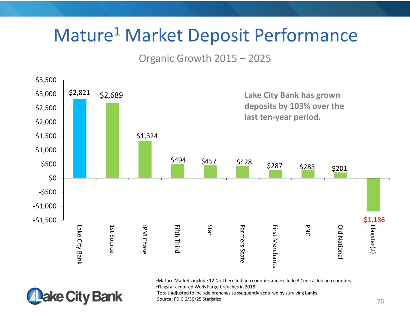 25 Lake City Bank Culture High Quality Team Members • Our culture is our greatest asset and we will preserve it • Lake City University drives our culture • Our community involvement is real and critical to our strategy • Inclusion initiatives continue and create a culture of belonging • Our culture has not been diluted by acquisition