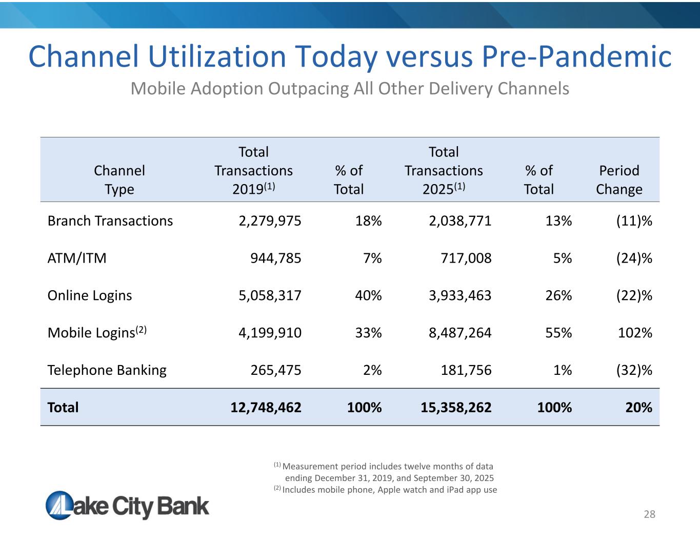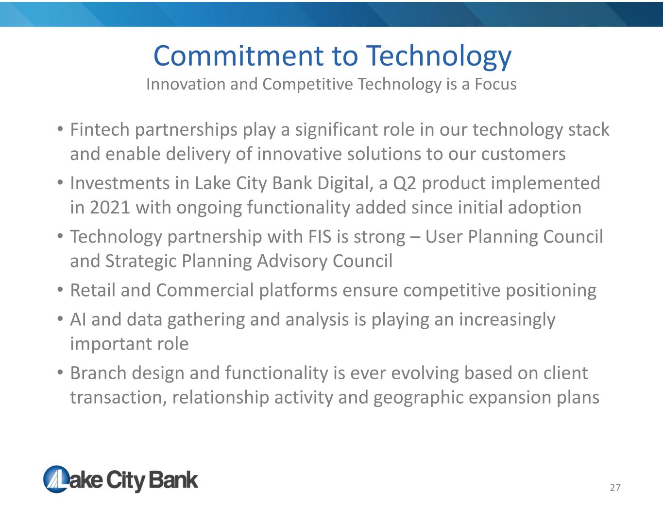 27 Commitment to Technology Innovation and Competitive Technology is a Focus • Fintech partnerships play a significant role in our technology stack and enable delivery of innovative solutions to our customers • Investments in Lake City Bank Digital, a Q2 product implemented in 2021 with ongoing functionality added since initial adoption • Technology partnership with FIS is strong – User Planning Council and Strategic Planning Advisory Council • Retail and Commercial platforms ensure competitive positioning • AI and data gathering and analysis is playing an increasingly important role • Branch design and functionality is ever evolving based on client transaction, relationship activity and geographic expansion plans