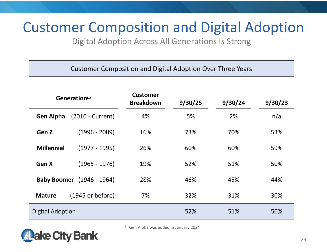28 Channel Utilization Today versus Pre-Pandemic Mobile Adoption Outpacing All Other Delivery Channels Period Change % of Total Total Transactions 2025(1) % of Total Total Transactions 2019(1) Channel Type (11)%13%2,038,77118%2,279,975Branch Transactions (24)%5%717,0087%944,785ATM/ITM (22)%26%3,933,46340%5,058,317Online Logins 102%55%8,487,26433%4,199,910Mobile Logins(2) (32)%1%181,7562%265,475Telephone Banking 20%100%15,358,262100%12,748,462Total (1) Measurement period includes twelve months of data ending December 31, 2019, and September 30, 2025 (2) Includes mobile phone, Apple watch and iPad app use