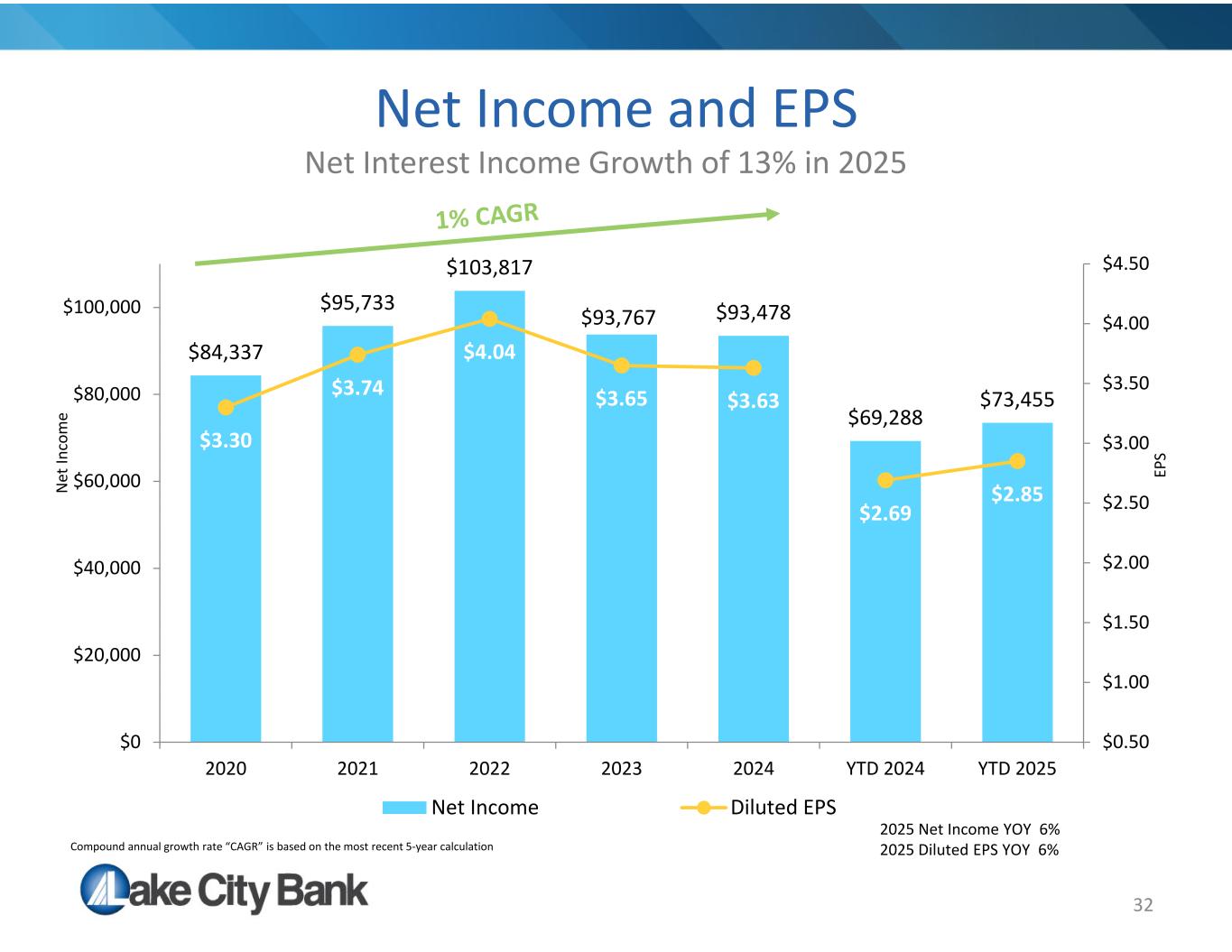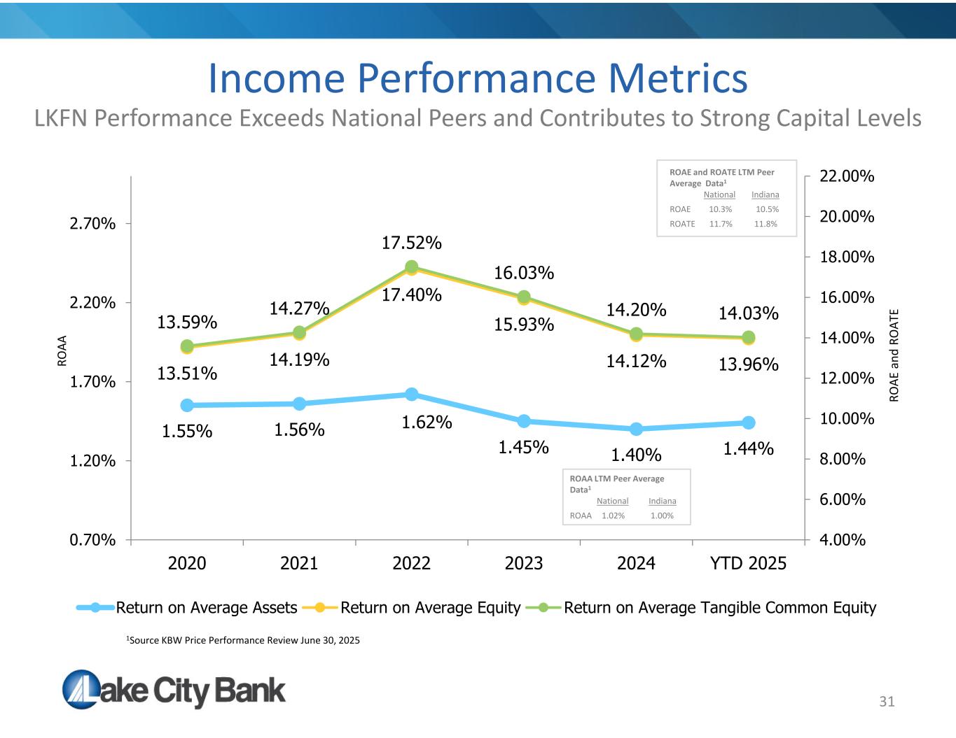 31 Income Performance Metrics LKFN Performance Exceeds National Peers and Contributes to Strong Capital Levels 1.55% 1.56% 1.62% 1.45% 1.40% 1.44% 13.51% 14.19% 17.40% 15.93% 14.12% 13.96% 13.59% 14.27% 17.52% 16.03% 14.20% 14.03% 4.00% 6.00% 8.00% 10.00% 12.00% 14.00% 16.00% 18.00% 20.00% 22.00% 0.70% 1.20% 1.70% 2.20% 2.70% 2020 2021 2022 2023 2024 YTD 2025 Return on Average Assets Return on Average Equity Return on Average Tangible Common Equity RO AA RO AE a nd R O AT E 1Source KBW Price Performance Review June 30, 2025 ROAE and ROATE LTM Peer Average Data1 National Indiana ROAE 10.3% 10.5% ROATE 11.7% 11.8% ROAA LTM Peer Average Data1 National Indiana ROAA 1.02% 1.00%