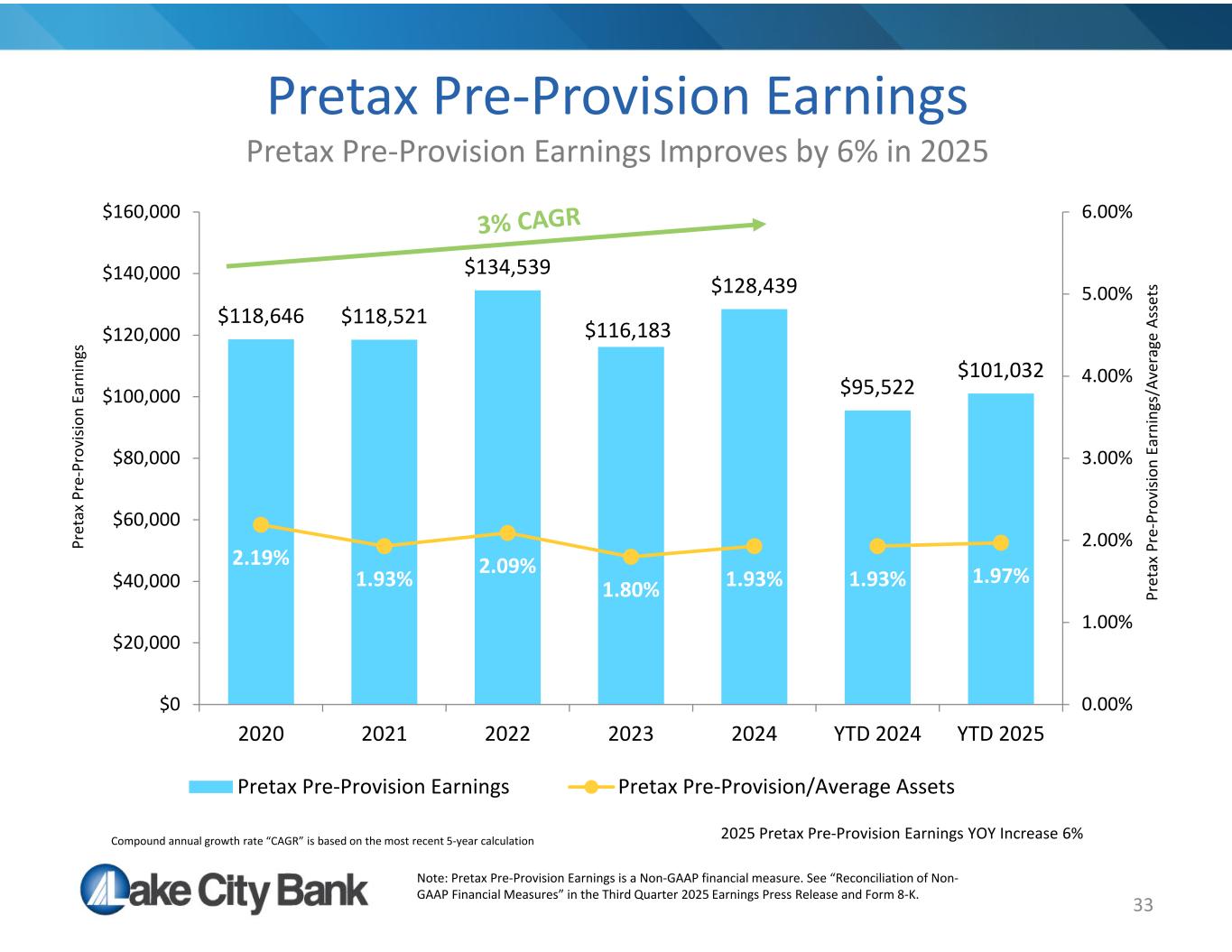 32 Net Income and EPS Net Interest Income Growth of 13% in 2025 $84,337 $95,733 $103,817 $93,767 $93,478 $69,288 $73,455 $3.30 $3.74 $4.04 $3.65 $3.63 $2.69 $2.85 $0.50 $1.00 $1.50 $2.00 $2.50 $3.00 $3.50 $4.00 $4.50 $0 $20,000 $40,000 $60,000 $80,000 $100,000 2020 2021 2022 2023 2024 YTD 2024 YTD 2025 Net Income Diluted EPS N et In co m e EP S 2025 Net Income YOY 6% 2025 Diluted EPS YOY 6%Compound annual growth rate “CAGR” is based on the most recent 5-year calculation