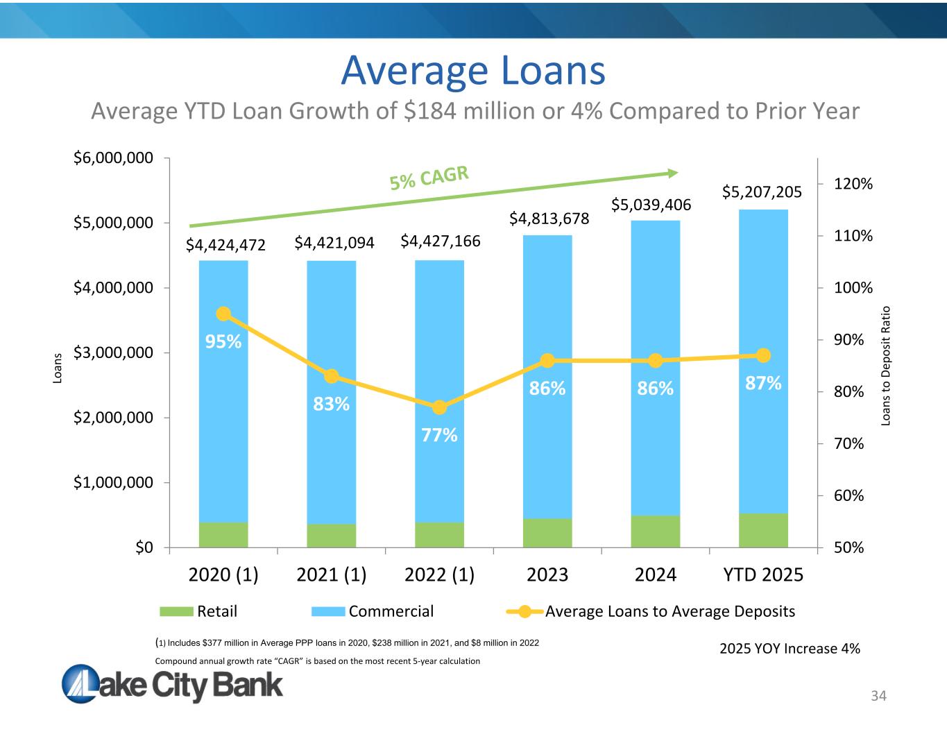 33 Pretax Pre-Provision Earnings Pretax Pre-Provision Earnings Improves by 6% in 2025 $118,646 $118,521 $134,539 $116,183 $128,439 $95,522 $101,032 2.19% 1.93% 2.09% 1.80% 1.93% 1.93% 1.97% 0.00% 1.00% 2.00% 3.00% 4.00% 5.00% 6.00% $0 $20,000 $40,000 $60,000 $80,000 $100,000 $120,000 $140,000 $160,000 2020 2021 2022 2023 2024 YTD 2024 YTD 2025 Pretax Pre-Provision Earnings Pretax Pre-Provision/Average Assets Pr et ax P re -P ro vi sio n Ea rn in gs Pr et ax P re -P ro vi sio n Ea rn in gs /A ve ra ge A ss et s Note: Pretax Pre-Provision Earnings is a Non-GAAP financial measure. See “Reconciliation of Non- GAAP Financial Measures” in the Third Quarter 2025 Earnings Press Release and Form 8-K. 2025 Pretax Pre-Provision Earnings YOY Increase 6%Compound annual growth rate “CAGR” is based on the most recent 5-year calculation