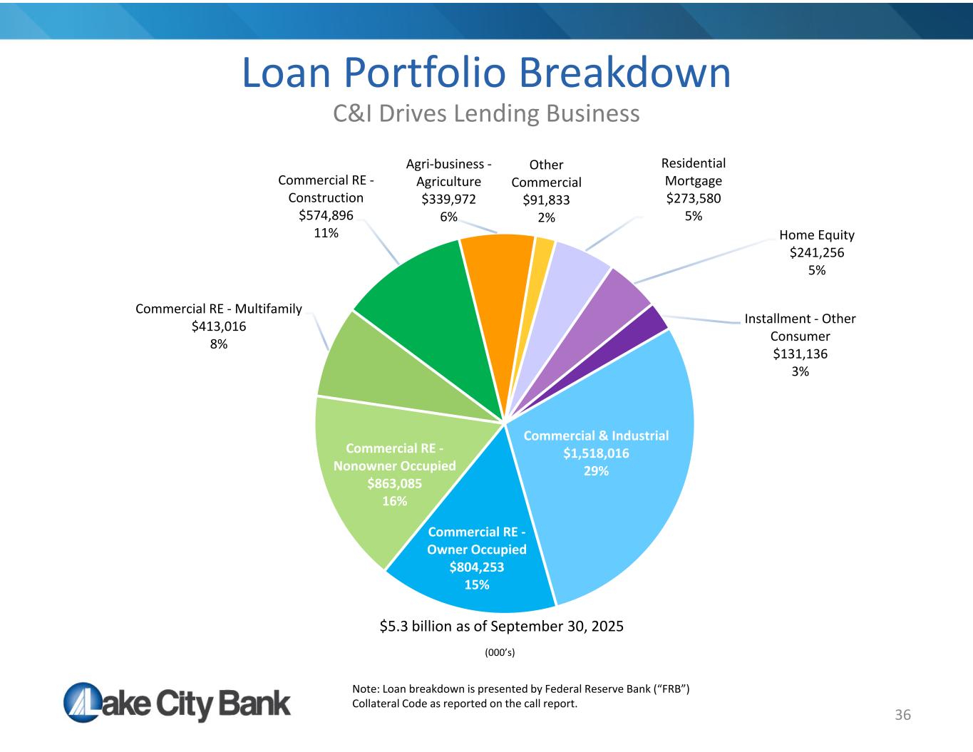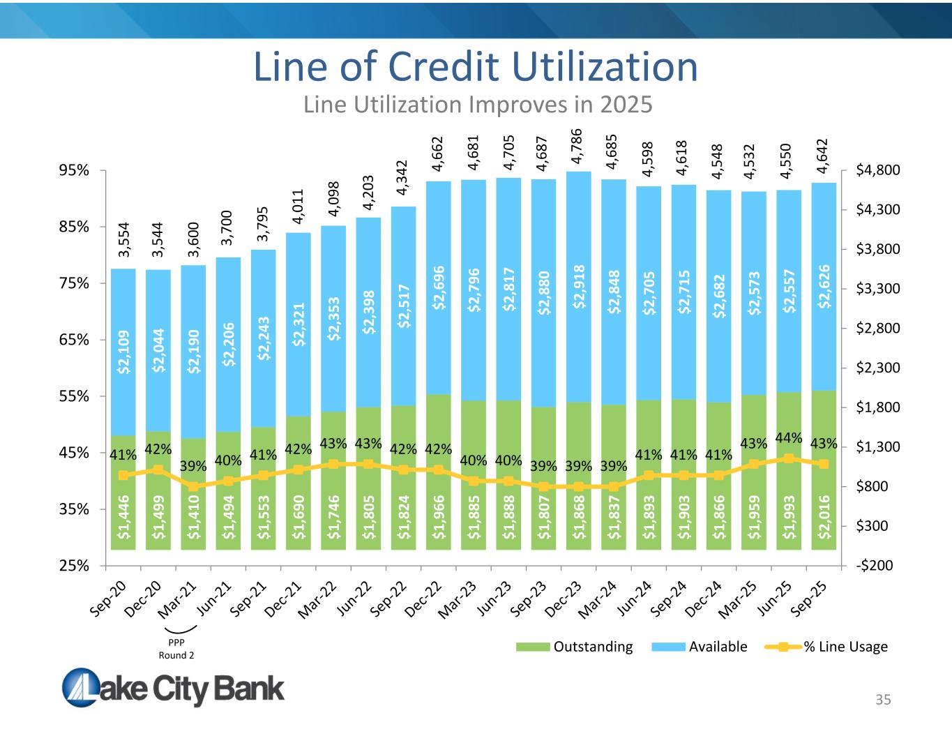 $1 ,4 46 $1 ,4 99 $1 ,4 10 $1 ,4 94 $1 ,5 53 $1 ,6 90 $1 ,7 46 $1 ,8 05 $1 ,8 24 $1 ,9 66 $1 ,8 85 $1 ,8 88 $1 ,8 07 $1 ,8 68 $1 ,8 37 $1 ,8 93 $1 ,9 03 $1 ,8 66 $1 ,9 59 $1 ,9 93 $2 ,0 16 $2 ,1 09 $2 ,0 44 $2 ,1 90 $2 ,2 06 $2 ,2 43 $2 ,3 21 $2 ,3 53 $2 ,3 98 $2 ,5 17 $2 ,6 96 $2 ,7 96 $2 ,8 17 $2 ,8 80 $2 ,9 18 $2 ,8 48 $2 ,7 05 $2 ,7 15 $2 ,6 82 $2 ,5 73 $2 ,5 57 $2 ,6 26 41% 42% 39% 40% 41% 42% 43% 43% 42% 42% 40% 40% 39% 39% 39% 41% 41% 41% 43% 44% 43% -$200 $300 $800 $1,300 $1,800 $2,300 $2,800 $3,300 $3,800 $4,300 $4,800 25% 35% 45% 55% 65% 75% 85% 95% Outstanding Available % Line Usage 35 Line of Credit Utilization Line Utilization Improves in 2025 4, 78 6 3, 55 4 3, 54 4 3, 60 0 3, 70 0 3, 79 5 4, 01 1 4, 20 3 4, 09 8 4, 34 2 4, 66 2 PPP Round 2 4, 68 1 4, 70 5 4, 68 7 4, 68 5 4, 59 8 4, 61 8 4, 54 8 4, 53 2 4, 55 0 4, 64 2