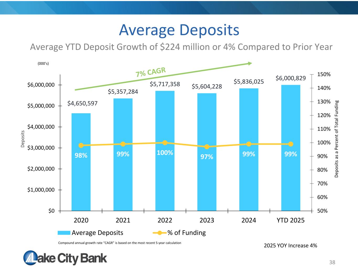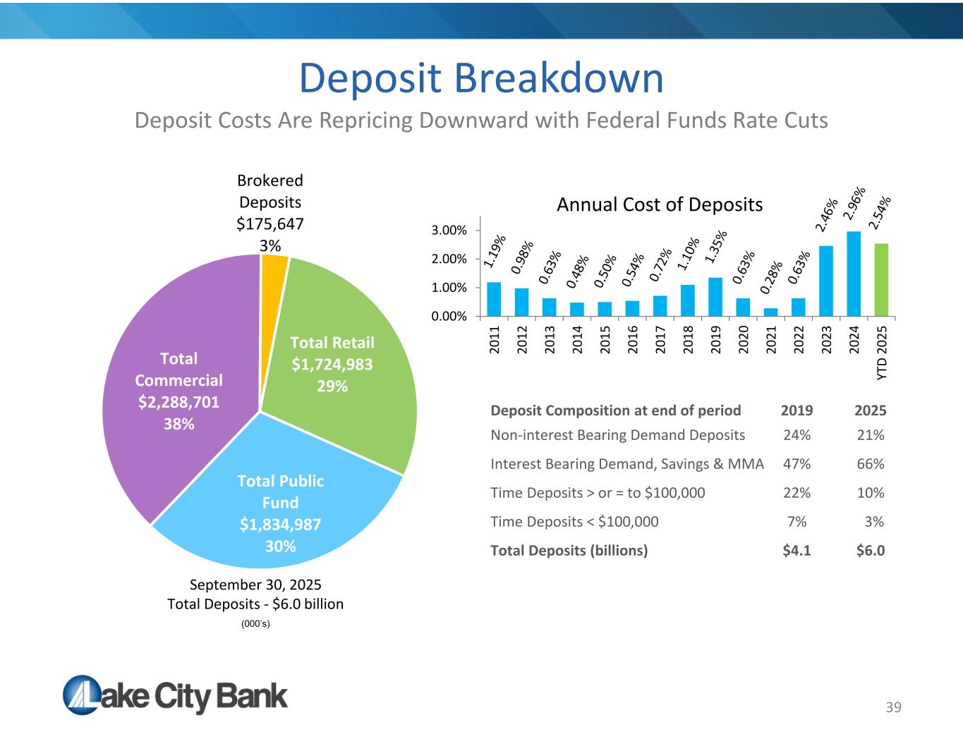 $4,650,597 $5,357,284 $5,717,358 $5,604,228 $5,836,025 $6,000,829 98% 99% 100% 97% 99% 99% 50% 60% 70% 80% 90% 100% 110% 120% 130% 140% 150% $0 $1,000,000 $2,000,000 $3,000,000 $4,000,000 $5,000,000 $6,000,000 2020 2021 2022 2023 2024 YTD 2025 Average Deposits % of Funding 38 Average Deposits Average YTD Deposit Growth of $224 million or 4% Compared to Prior Year De po sit s De po sit s as a P er ce nt o f T ot al F un di ng (000’s) 2025 YOY Increase 4%Compound annual growth rate “CAGR” is based on the most recent 5-year calculation