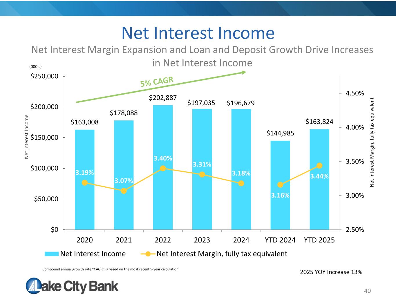 39 Deposit Breakdown Deposit Costs Are Repricing Downward with Federal Funds Rate Cuts Total Retail $1,724,983 29% Total Public Fund $1,834,987 30% Total Commercial $2,288,701 38% Brokered Deposits $175,647 3% September 30, 2025 Total Deposits - $6.0 billion (000’s) 0.00% 1.00% 2.00% 3.00% 20 11 20 12 20 13 20 14 20 15 20 16 20 17 20 18 20 19 20 20 20 21 20 22 20 23 20 24 YT D 20 25 Annual Cost of Deposits 20252019Deposit Composition at end of period 21%24%Non-interest Bearing Demand Deposits 66%47%Interest Bearing Demand, Savings & MMA 10%22%Time Deposits > or = to $100,000 3%7%Time Deposits < $100,000 $6.0$4.1Total Deposits (billions)