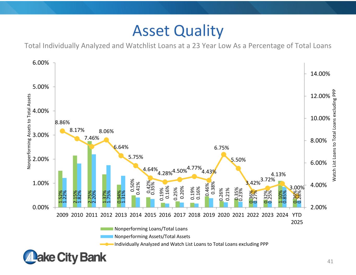 40 Net Interest Income Net Interest Margin Expansion and Loan and Deposit Growth Drive Increases in Net Interest Income $163,008 $178,088 $202,887 $197,035 $196,679 $144,985 $163,824 3.19% 3.07% 3.40% 3.31% 3.18% 3.16% 3.44% 2.50% 3.00% 3.50% 4.00% 4.50% $0 $50,000 $100,000 $150,000 $200,000 $250,000 2020 2021 2022 2023 2024 YTD 2024 YTD 2025 Net Interest Income Net Interest Margin, fully tax equivalent (000’s) N et In te re st In co m e N et In te re st M ar gi n, fu lly ta x eq ui va le nt 2025 YOY Increase 13%Compound annual growth rate “CAGR” is based on the most recent 5-year calculation