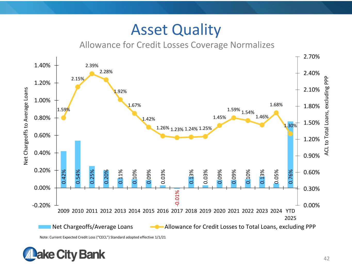 41 Asset Quality Total Individually Analyzed and Watchlist Loans at a 23 Year Low As a Percentage of Total Loans 1. 52 % 2. 15 % 2. 75 % 1. 37 % 0. 94 % 0. 50 % 0. 42 % 0. 19 % 0. 25 % 0. 19 % 0. 46 % 0. 26 % 0. 35 % 0. 36 % 0. 32 % 1. 10 % 0. 36 % 1. 22 % 1. 82 % 2. 20 % 1. 75 % 1. 31 % 0. 41 % 0. 35 % 0. 16 % 0. 20 % 0. 16 % 0. 38 % 0. 21 % 0. 23 % 0. 27 % 0. 25 % 0. 85 % 0. 28 % 8.86% 8.17% 7.46% 8.06% 6.64% 5.75% 4.64% 4.28%4.50%4.77% 4.43% 6.75% 5.50% 3.42%3.72% 4.13% 3.00% 2.00% 4.00% 6.00% 8.00% 10.00% 12.00% 14.00% 0.00% 1.00% 2.00% 3.00% 4.00% 5.00% 6.00% 2009 2010 2011 2012 2013 2014 2015 2016 2017 2018 2019 2020 2021 2022 2023 2024 YTD 2025 Nonperforming Loans/Total Loans Nonperforming Assets/Total Assets Individually Analyzed and Watch List Loans to Total Loans excluding PPP N on pe rf or m in g As se ts to T ot al A ss et s W at ch L ist L oa ns to T ot al L oa ns e xc lu di ng P PP