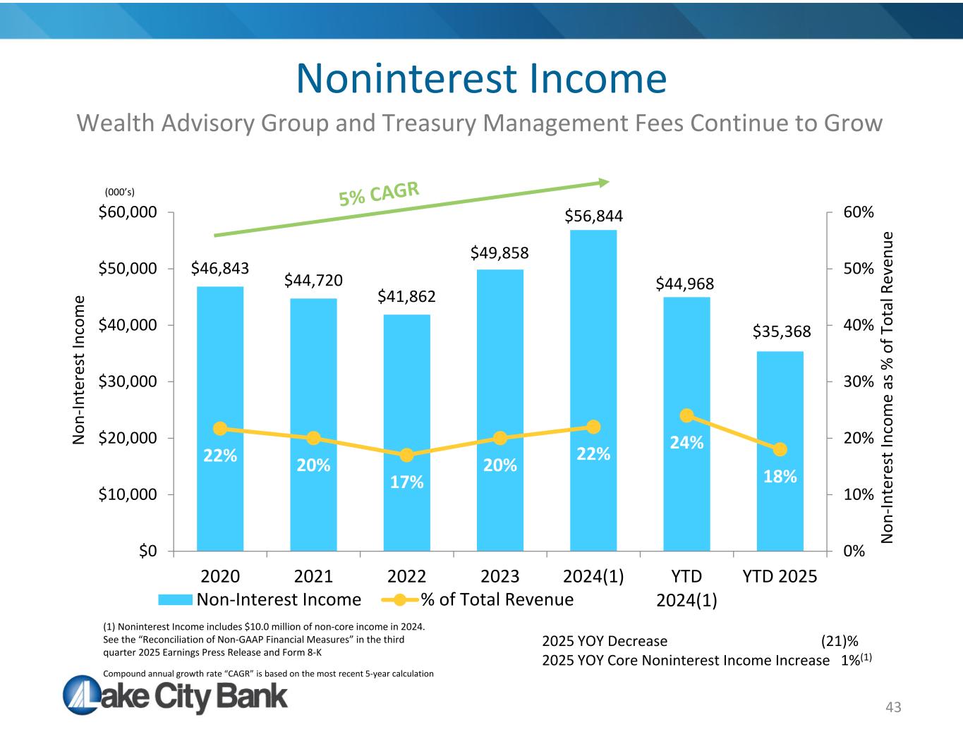 42 Asset Quality Allowance for Credit Losses Coverage Normalizes 0. 42 % 0. 54 % 0. 25 % 0. 20 % 0. 11 % 0. 10 % 0. 09 % 0. 03 % -0 .0 1% 0. 13 % 0. 03 % 0. 09 % 0. 09 % 0. 10 % 0. 13 % 0. 05 % 0. 76 % 1.59% 2.15% 2.39% 2.28% 1.92% 1.67% 1.42% 1.26% 1.23% 1.24% 1.25% 1.45% 1.59% 1.54% 1.46% 1.68% 1.30% 0.00% 0.30% 0.60% 0.90% 1.20% 1.50% 1.80% 2.10% 2.40% 2.70% -0.20% 0.00% 0.20% 0.40% 0.60% 0.80% 1.00% 1.20% 1.40% 2009 2010 2011 2012 2013 2014 2015 2016 2017 2018 2019 2020 2021 2022 2023 2024 YTD 2025 AC L to T ot al L oa ns , e xc lu di ng P PP N et C ha rg eo ffs to A ve ra ge L oa ns Net Chargeoffs/Average Loans Allowance for Credit Losses to Total Loans, excluding PPP Note: Current Expected Credit Loss (“CECL”) Standard adopted effective 1/1/21