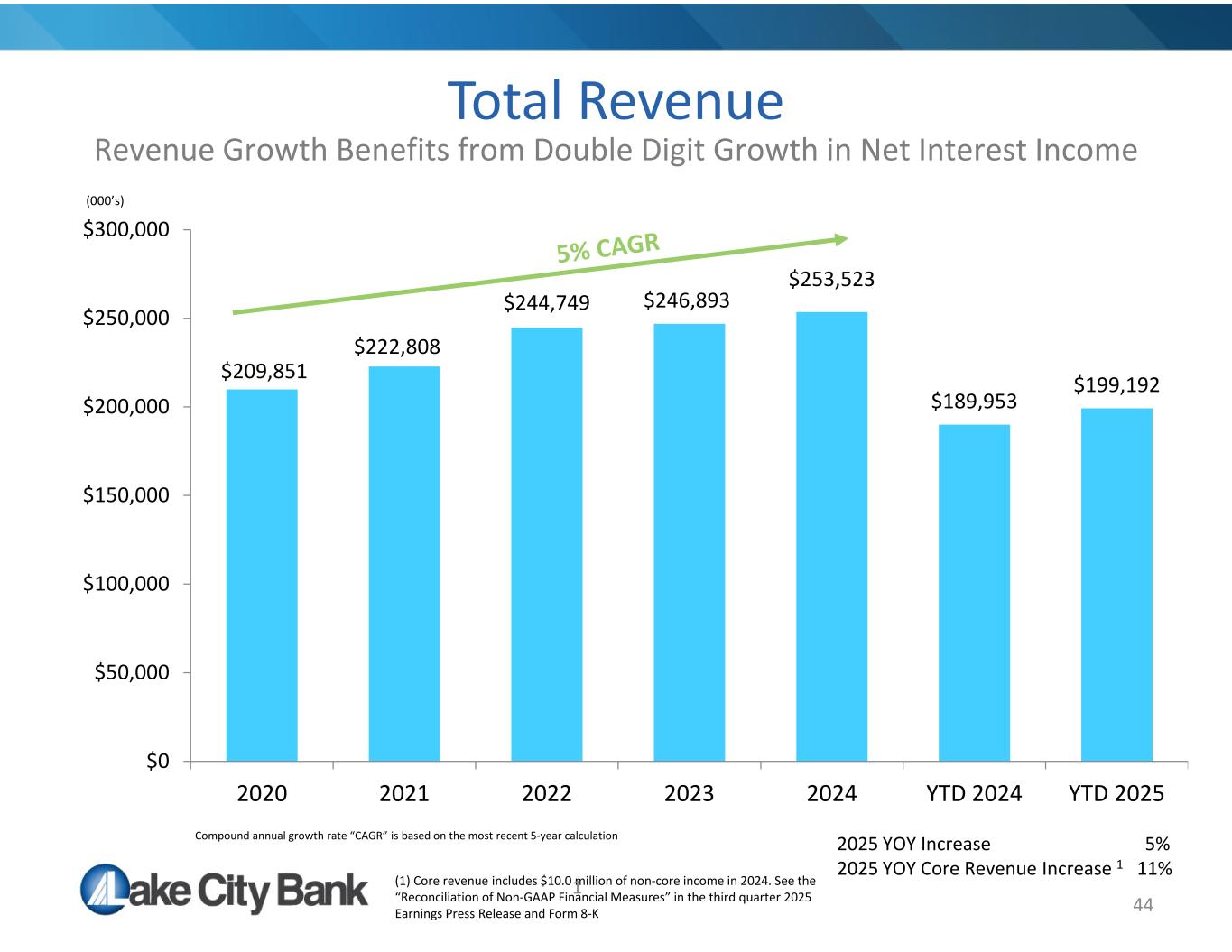 43 Noninterest Income Wealth Advisory Group and Treasury Management Fees Continue to Grow $46,843 $44,720 $41,862 $49,858 $56,844 $44,968 $35,368 22% 20% 17% 20% 22% 24% 18% 0% 10% 20% 30% 40% 50% 60% $0 $10,000 $20,000 $30,000 $40,000 $50,000 $60,000 2020 2021 2022 2023 2024(1) YTD 2024(1) YTD 2025 N on -In te re st In co m e as % o f T ot al R ev en ue N on -In te re st In co m e Non-Interest Income % of Total Revenue 2025 YOY Decrease (21)% 2025 YOY Core Noninterest Income Increase 1%(1) (000’s) (1) Noninterest Income includes $10.0 million of non-core income in 2024. See the “Reconciliation of Non-GAAP Financial Measures” in the third quarter 2025 Earnings Press Release and Form 8-K Compound annual growth rate “CAGR” is based on the most recent 5-year calculation