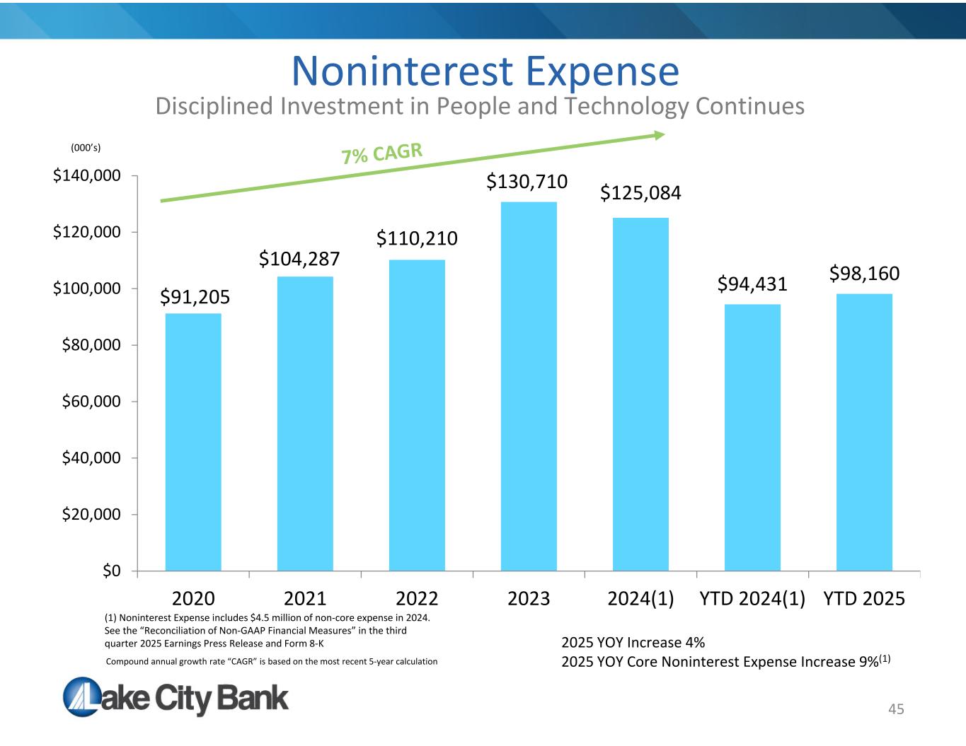 44 2025 YOY Increase 5% 2025 YOY Core Revenue Increase 1 11% Total Revenue Revenue Growth Benefits from Double Digit Growth in Net Interest Income $209,851 $222,808 $244,749 $246,893 $253,523 $189,953 $199,192 $0 $50,000 $100,000 $150,000 $200,000 $250,000 $300,000 2020 2021 2022 2023 2024 YTD 2024 YTD 2025 (000’s) Compound annual growth rate “CAGR” is based on the most recent 5-year calculation (1) Core revenue includes $10.0 million of non-core income in 2024. See the “Reconciliation of Non-GAAP Financial Measures” in the third quarter 2025 Earnings Press Release and Form 8-K 1