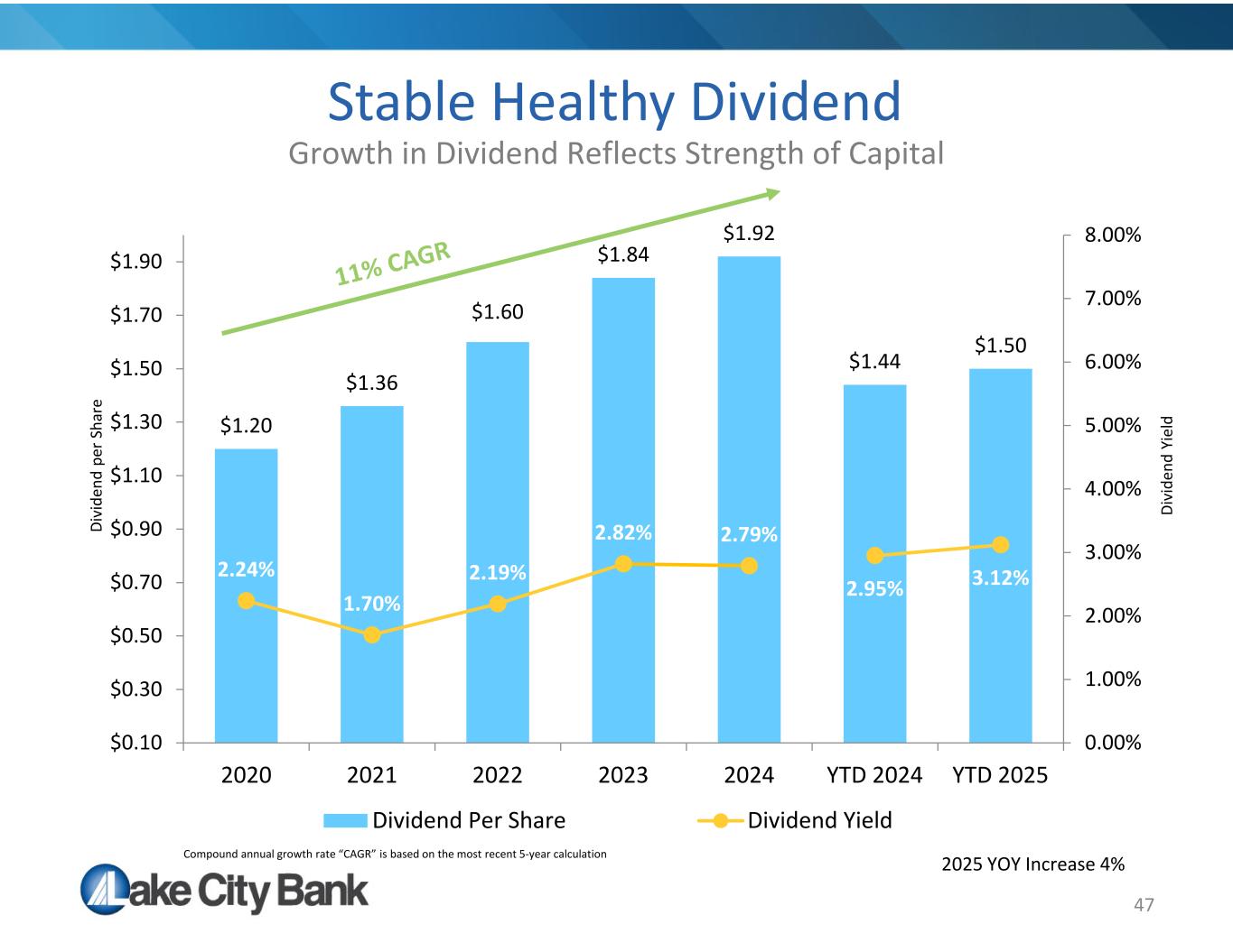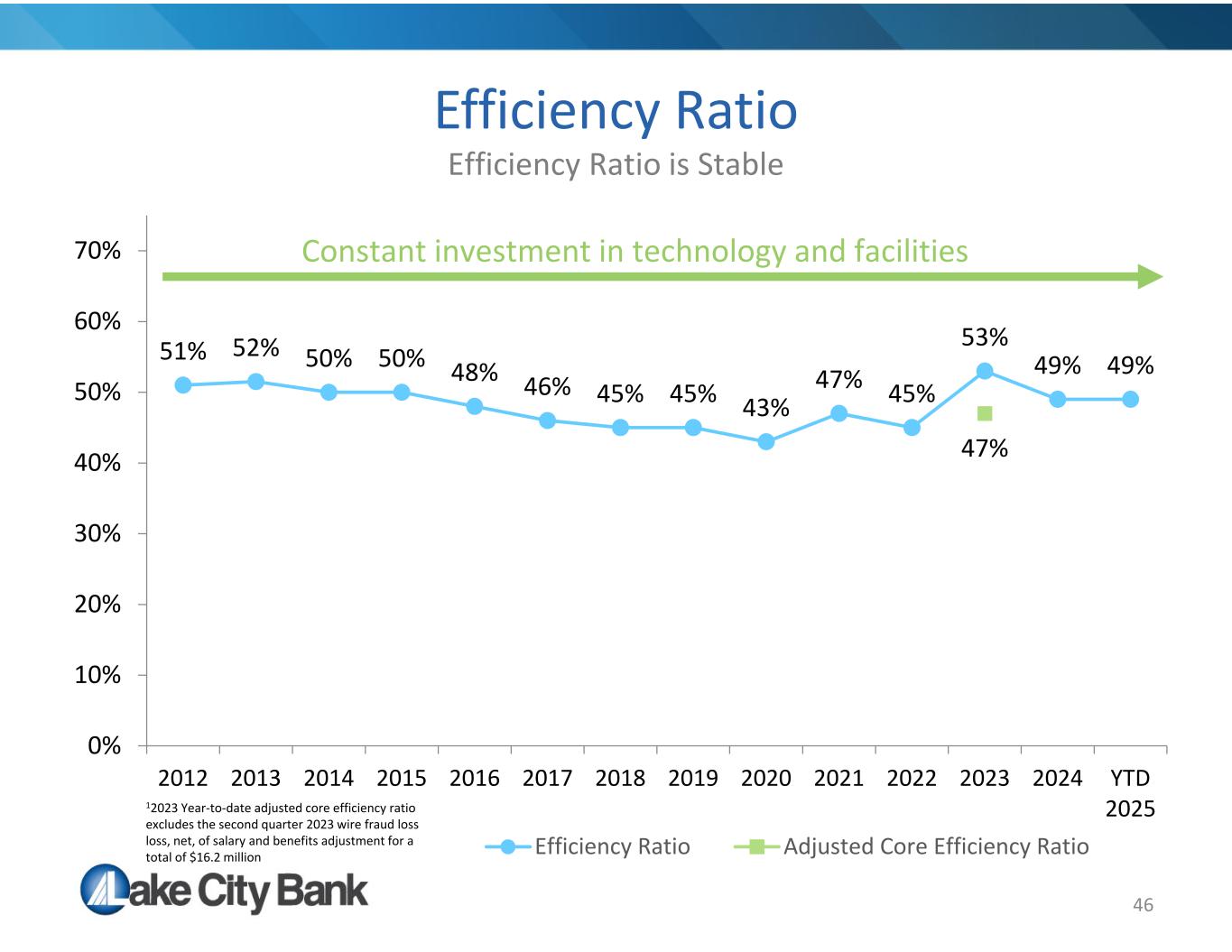 46 Efficiency Ratio Efficiency Ratio is Stable 51% 52% 50% 50% 48% 46% 45% 45% 43% 47% 45% 53% 49% 49% 47% 0% 10% 20% 30% 40% 50% 60% 70% 2012 2013 2014 2015 2016 2017 2018 2019 2020 2021 2022 2023 2024 YTD 2025 Efficiency Ratio Adjusted Core Efficiency Ratio Constant investment in technology and facilities 12023 Year-to-date adjusted core efficiency ratio excludes the second quarter 2023 wire fraud loss loss, net, of salary and benefits adjustment for a total of $16.2 million
