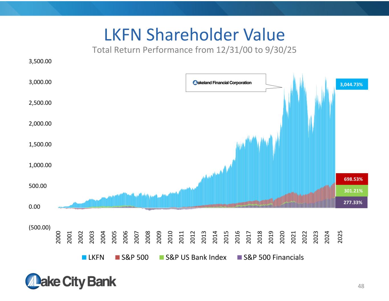 48 LKFN Shareholder Value Total Return Performance from 12/31/00 to 9/30/25 20 00 20 01 20 02 20 03 20 04 20 05 20 06 20 07 20 08 20 09 20 10 20 11 20 12 20 13 20 14 20 15 20 16 20 17 20 18 20 19 20 20 20 21 20 22 20 23 20 24 LKFN S&P 500 S&P US Bank Index S&P 500 Financials 3,044.73% 698.53% 301.21% 277.33% 3,500.00 3,000.00 2,500.00 2,000.00 1,500.00 1,000.00 500.00 0.00 (500.00) 20 25