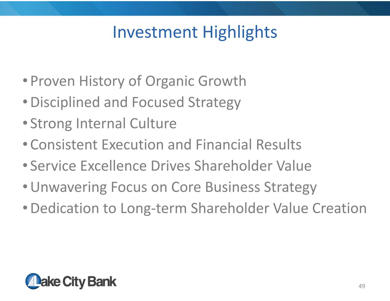 49 Investment Highlights • Proven History of Organic Growth • Disciplined and Focused Strategy • Strong Internal Culture • Consistent Execution and Financial Results • Service Excellence Drives Shareholder Value • Unwavering Focus on Core Business Strategy • Dedication to Long-term Shareholder Value Creation
