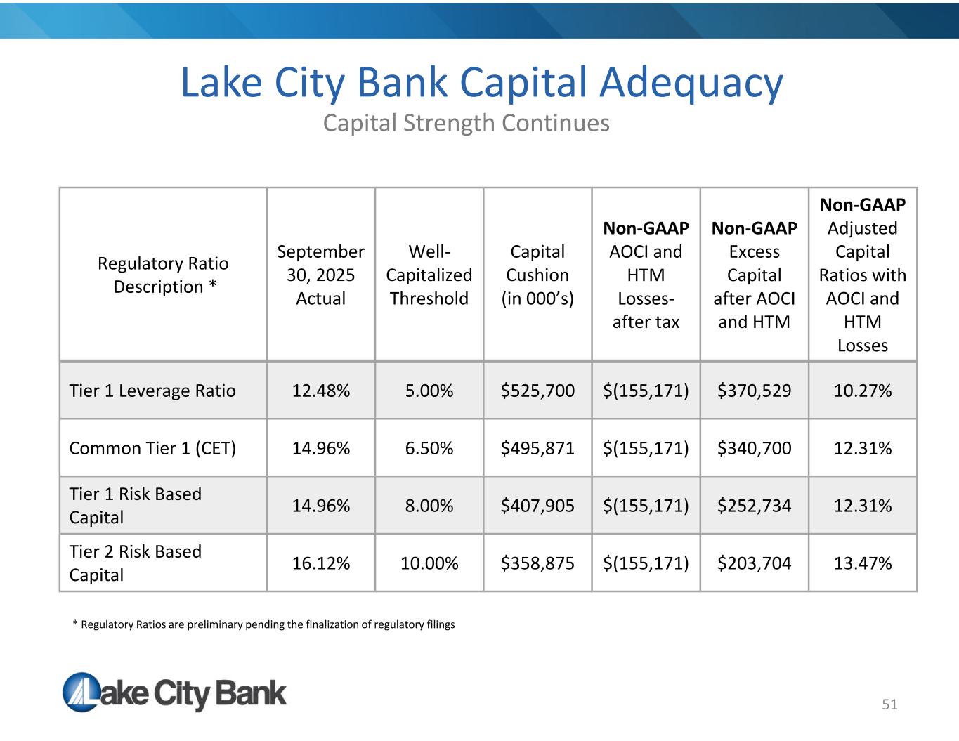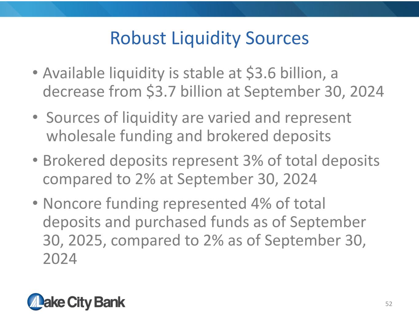 51 Lake City Bank Capital Adequacy Capital Strength Continues Non-GAAP Adjusted Capital Ratios with AOCI and HTM Losses Non-GAAP Excess Capital after AOCI and HTM Non-GAAP AOCI and HTM Losses- after tax Capital Cushion (in 000’s) Well- Capitalized Threshold September 30, 2025 Actual Regulatory Ratio Description * 10.27%$370,529$(155,171)$525,7005.00%12.48%Tier 1 Leverage Ratio 12.31%$340,700$(155,171)$495,8716.50%14.96%Common Tier 1 (CET) 12.31%$252,734$(155,171)$407,9058.00%14.96%Tier 1 Risk Based Capital 13.47%$203,704$(155,171)$358,87510.00%16.12%Tier 2 Risk Based Capital * Regulatory Ratios are preliminary pending the finalization of regulatory filings