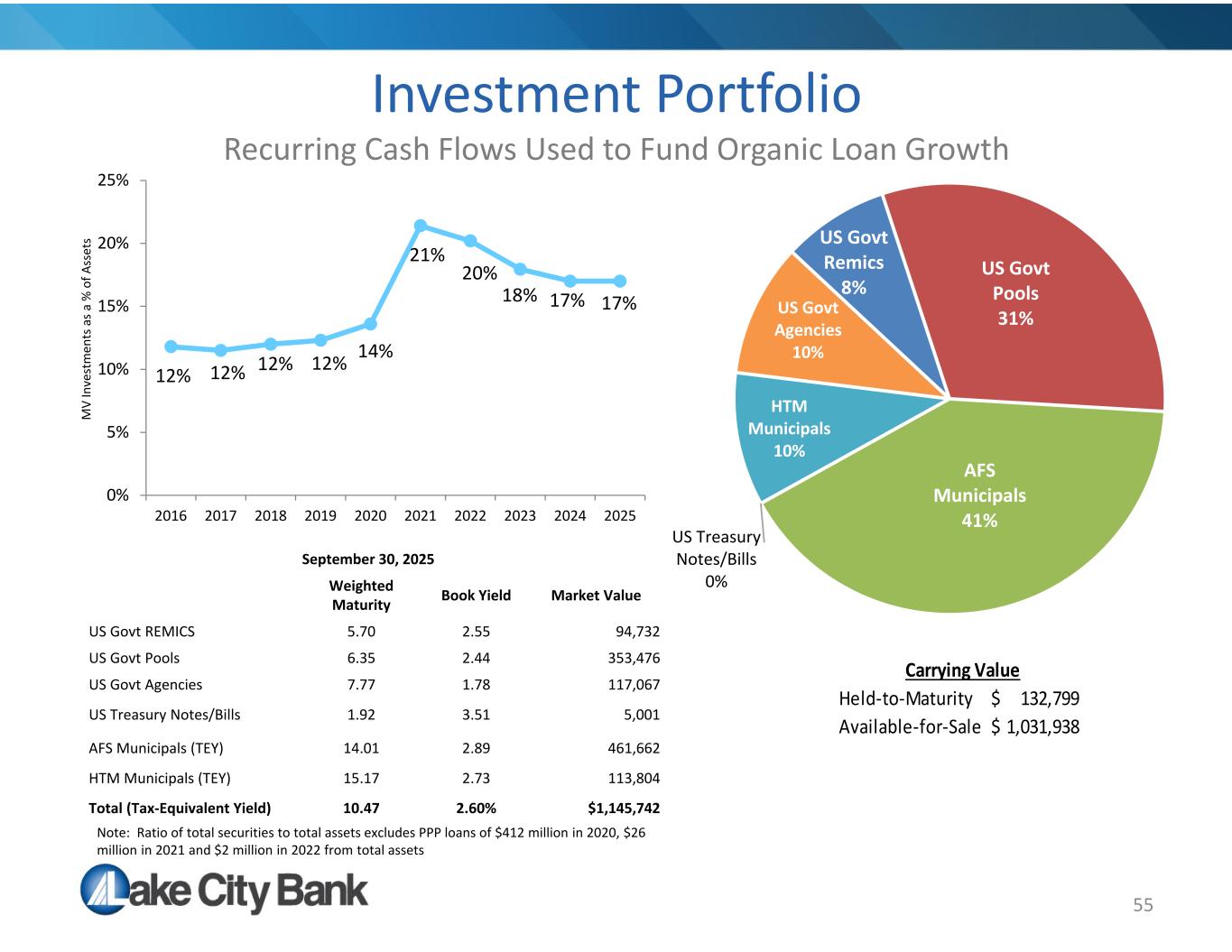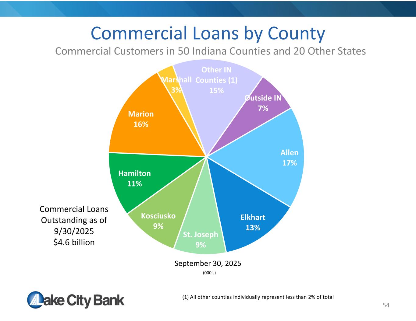 Additional Loan Collateral Available for PledgeUnused/ AvailableUsed Liquidity Availability(000) Secured/Committed Borrowings: $ --$ 595,174$ 56,200$ 651,374Federal Home Loan Bank-Indianapolis(1) 317,4331,287,717--1,287,717Federal Reserve Bank Discount Window $ 317,433 $ 1, 882,891$ 56,200$ 1,939,091 Total Secured/Committed Unsecured/Uncommitted Borrowings: $ --$ 608,052$ --$ 608,052Brokered Certificates of Deposit(2) --31,204175,647206,851Brokered Money Market Deposit(3) --100,000--100,000Insured Cash Sweep-One Way Buy(4) --395,000--395,000Fed Fund Lines $ --$ 1,134,256$ 175,647$ 1,309,903Total Unsecured/uncommitted borrowings Investment Securities available for pledge: --215,536--215,536Agencies, MBS and CMO(5) --352,605--352,605Municipals(6) --568,141--568,141Total Investment Securities Available $ 317,433$ 3,585,288$ 231,847$ 3,817,135Total Lake City Bank Liquidity Preparedness 53 Liquidity Preparedness September 30, 2025 (1) The BOD has authorized borrowing capacity up to $800 million, and qualifying collateral is required for availability (2) Brokered deposit capacity is equal to 10% of total deposits plus purchased funds, per LCB policy (3) Brokered money market capacity is equal to 3% of total assets, per LCB policy (4) Insured cash sweep OWB capacity is based on previous contracts with IntraFi Network (formerly Promontory) (5) Investment securities are eligible collateral at the FRB – Discount Window and FHLB (6) Municipal securities are eligible collateral at the FRB – Discount Window