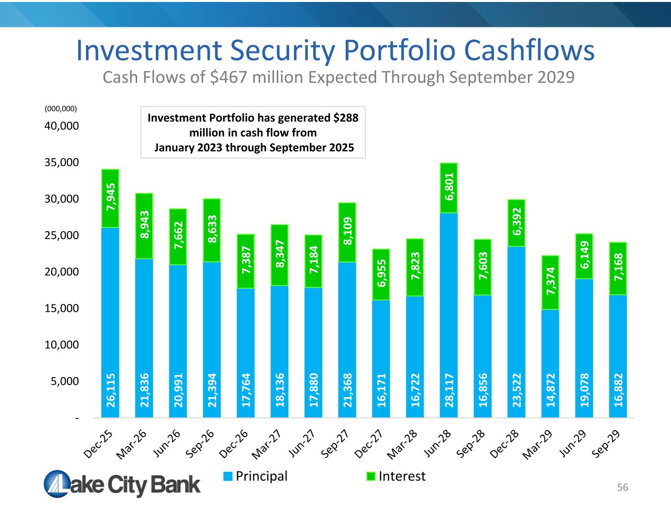 55 Investment Portfolio Recurring Cash Flows Used to Fund Organic Loan Growth M V In ve st m en ts a s a % o f A ss et s Note: Ratio of total securities to total assets excludes PPP loans of $412 million in 2020, $26 million in 2021 and $2 million in 2022 from total assets 12% 12% 12% 12% 14% 21% 20% 18% 17% 17% 0% 5% 10% 15% 20% 25% 2016 2017 2018 2019 2020 2021 2022 2023 2024 2025 September 30, 2025 Market ValueBook YieldWeighted Maturity 94,7322.555.70US Govt REMICS 353,4762.446.35US Govt Pools 117,0671.787.77US Govt Agencies 5,0013.511.92US Treasury Notes/Bills 461,6622.8914.01AFS Municipals (TEY) 113,8042.7315.17HTM Municipals (TEY) $1,145,7422.60%10.47Total (Tax-Equivalent Yield) Held-to-Maturity 132,799$ Available-for-Sale 1,031,938$ Carrying Value US Govt Remics 8% US Govt Pools 31% AFS Municipals 41% US Treasury Notes/Bills 0% HTM Municipals 10% US Govt Agencies 10%