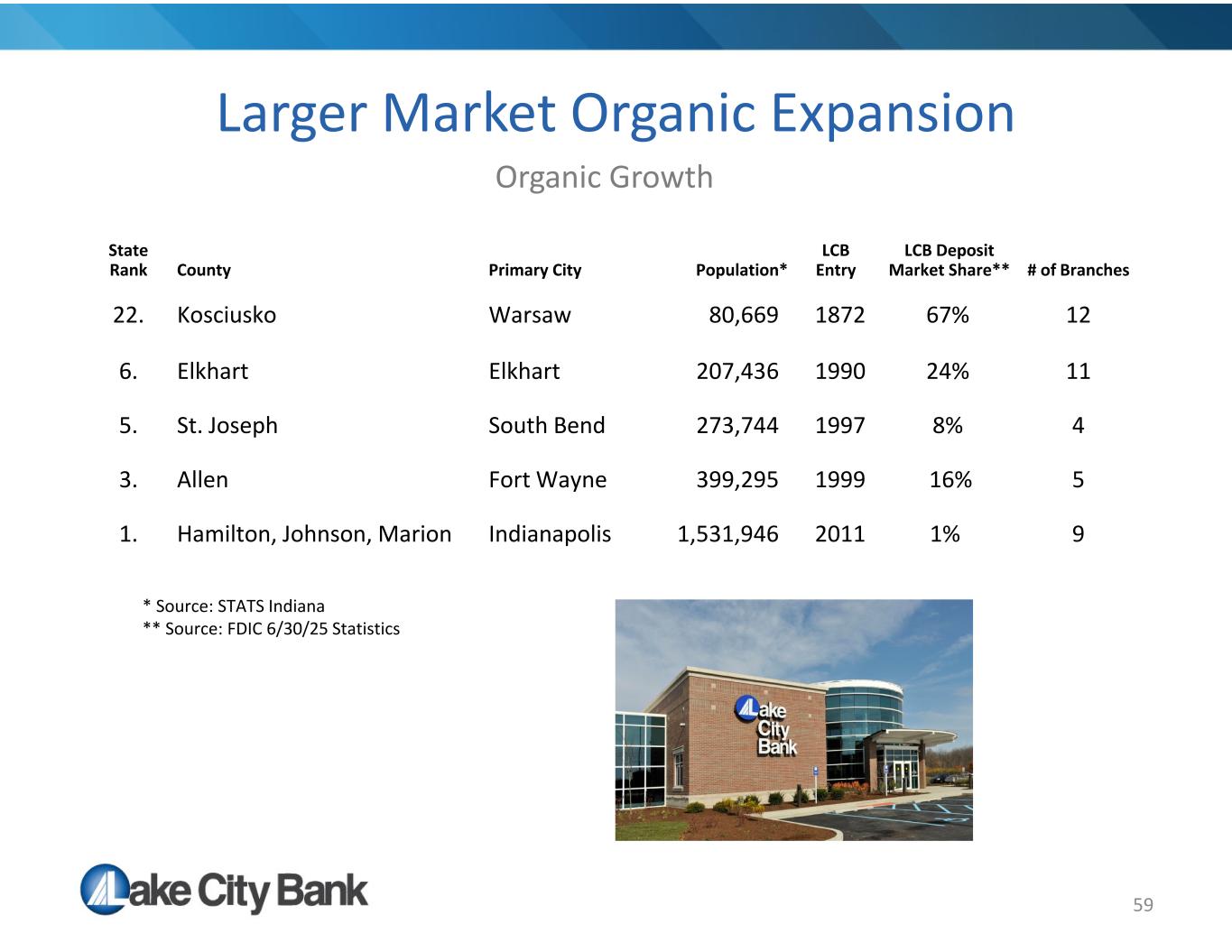 60 Branch Expansion Strategy for Growth Lake City Bank Deposits in Indianapolis Total $606 Million at June 30, 2025 Lake City Bank Branches Lake City Bank 2025 Deposit Market Share Lake City Bank 2025 Deposits (000’s) 2025 Deposits in Market (000’s) 25- year projected % growth 2050 Projected Population 2025 Population Indiana County 41.75%$495,564$28,239,46338%529,505384,401Hamilton 30.18%$80,015$43,268,4295%1,011,523965,874Marion 10.80%$30,700$3,855,29719%203,455171,056Johnson 00%n/a $1,842,74736%107,63478,948Boone 00%n/a$3,908,2586%201,073189,425Tippecanoe (Note: Population data sourced from www.stats.Indiana.edu and deposit market share from the FDIC as of June 30, 2025)