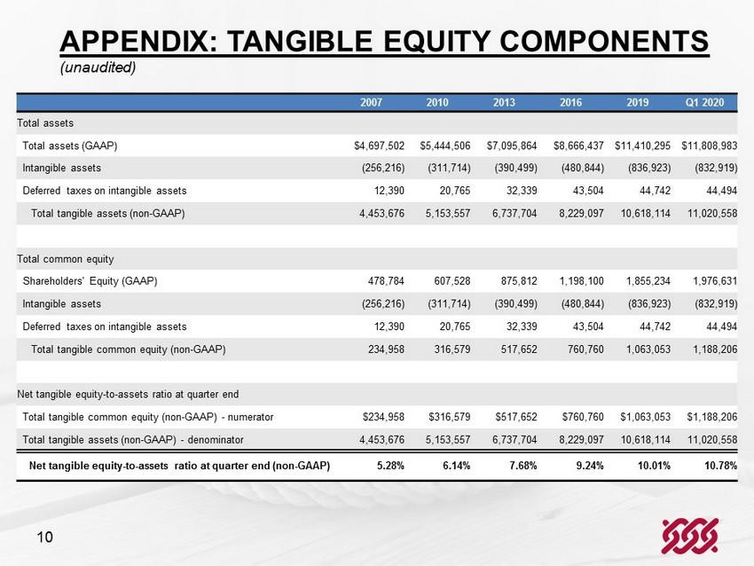 10 APPENDIX: TANGIBLE EQUITY COMPONENTS (unaudited ) 2007 2010 2013 2016 2019 Q1 2020 Total assets Total assets (GAAP) $4,697,502 $5,444,506 $7,095,864 $8,666,437 $11,410,295 $11,808,983 Intangible assets (256,216) (311,714) (390,499) (480,844) (836,923) (832,919) Deferred taxes on intangible assets 12,390 20,765 32,339 43,504 44,742 44,494 Total tangible assets (non - GAAP) 4,453,676 5,153,557 6,737,704 8,229,097 10,618,114 11,020,558 Total common equity Shareholders' Equity (GAAP) 478,784 607,528 875,812 1,198,100 1,855,234 1,976,631 Intangible assets (256,216) (311,714) (390,499) (480,844) (836,923) (832,919) Deferred taxes on intangible assets 12,390 20,765 32,339 43,504 44,742 44,494 Total tangible common equity (non - GAAP) 234,958 316,579 517,652 760,760 1,063,053 1,188,206 Net tangible equity - to - assets ratio at quarter end Total tangible common equity (non - GAAP) - numerator $234,958 $316,579 $517,652 $760,760 $1,063,053 $1,188,206 Total tangible assets (non - GAAP) - denominator 4,453,676 5,153,557 6,737,704 8,229,097 10,618,114 11,020,558 Net tangible equity - to - assets ratio at quarter end (non - GAAP) 5.28% 6.14% 7.68% 9.24% 10.01% 10.78%