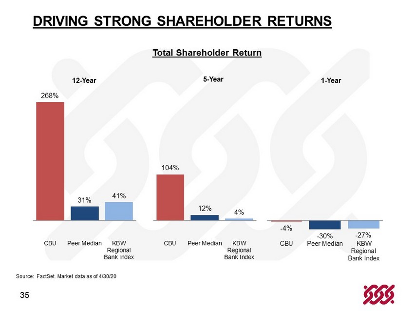 34 TOTAL SHAREHOLDER RETURNS (ANNUALIZED) (Through April 30, 2020 or most recent available, Including Reinvestment of Dividends) 1 Year 5 Years 10 Years 12 Years 15 Years CBU (3.6%) 15.3% 13.3% 11.5% 10 .9% S&P 600 Commercial Banks Index (23.3%) 3.3 % 7.3% 3.6% 1.5% KBW Regional Bank Index (27.4%) 0.7% 5.1% 2.9% 1.3% S&P 500 Index 0.8% 9.1% 11.7% 8.7% 8.6% Dow Jones Industrial Average (6.1%) 9.1% 11.0% 8.3% 8.7% Prior to Financial Crisis Source: Bloomberg