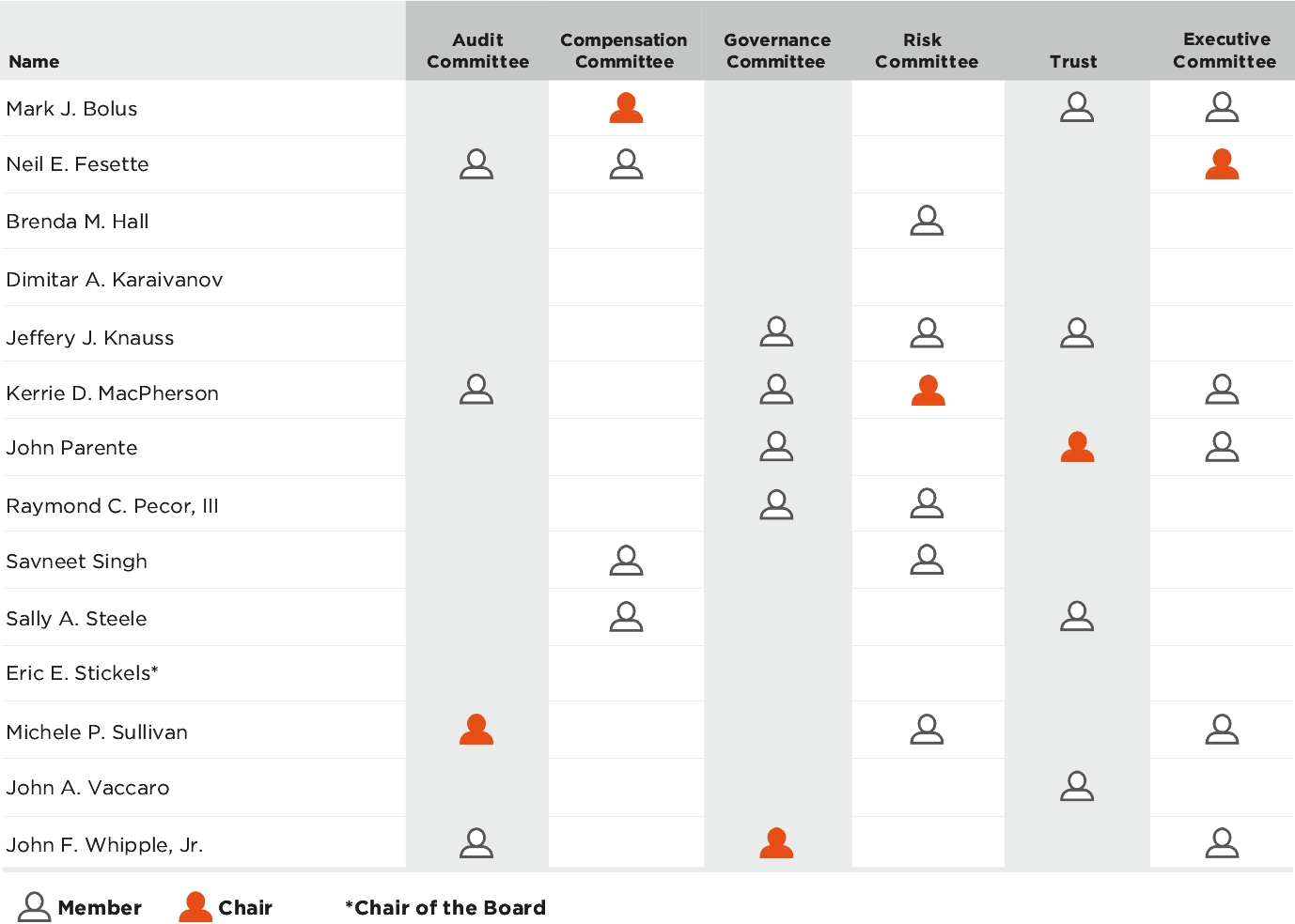 Based on these independence standards, the Board determined that the following individuals who served as Directors during all or part of the last fiscal year were independent Directors during such year and continue to be deemed independent by the Board: Mark J. Bolus, Neil E. Fesette, Jeffery J. Knauss, Kerrie D. MacPherson, John Parente, Raymond C. Pecor, III, Savneet Singh, Susan E. Skerritt (retired), Sally A. Steele, Eric E. Stickels, Michele P. Sullivan, John A. Vaccaro, and John F. Whipple, Jr.